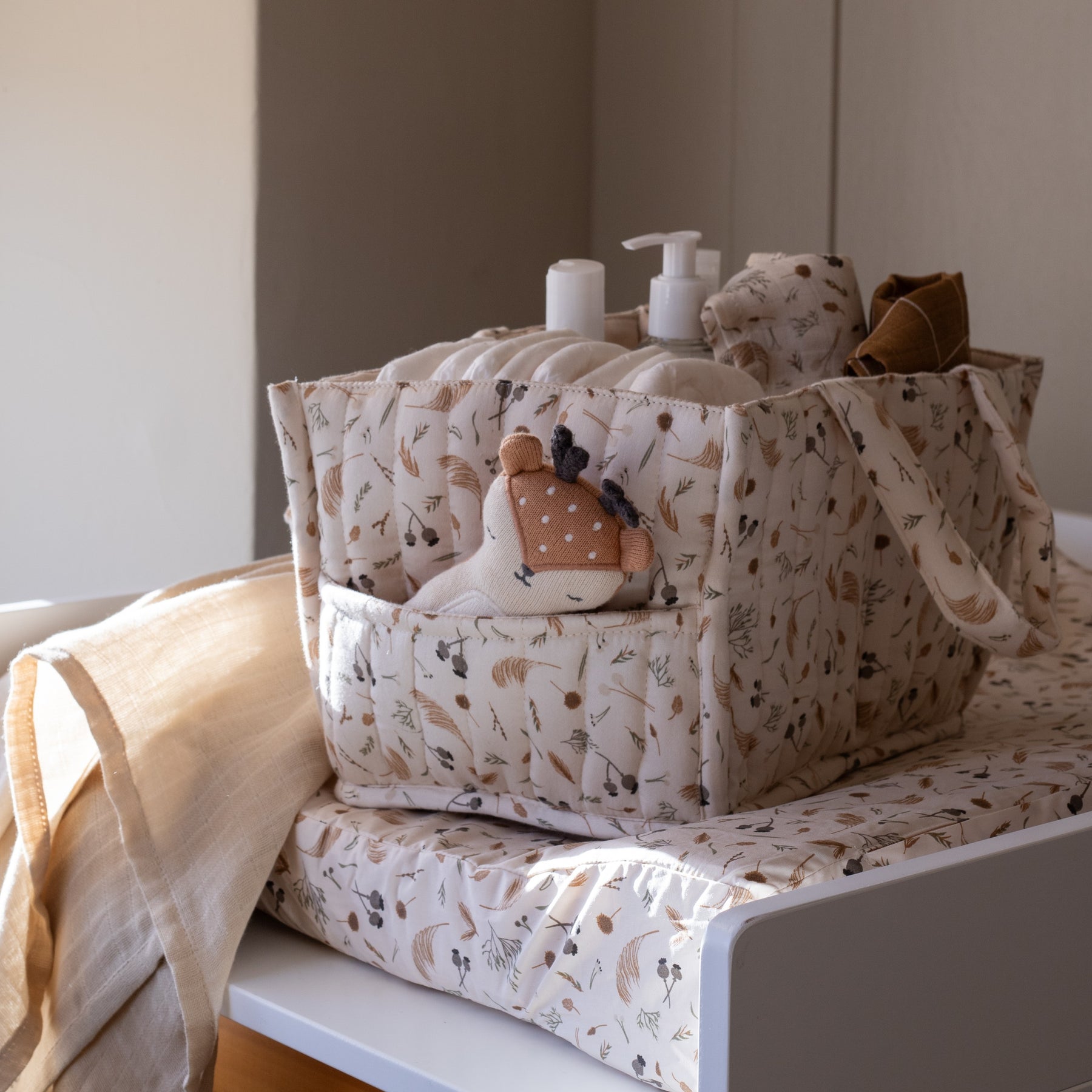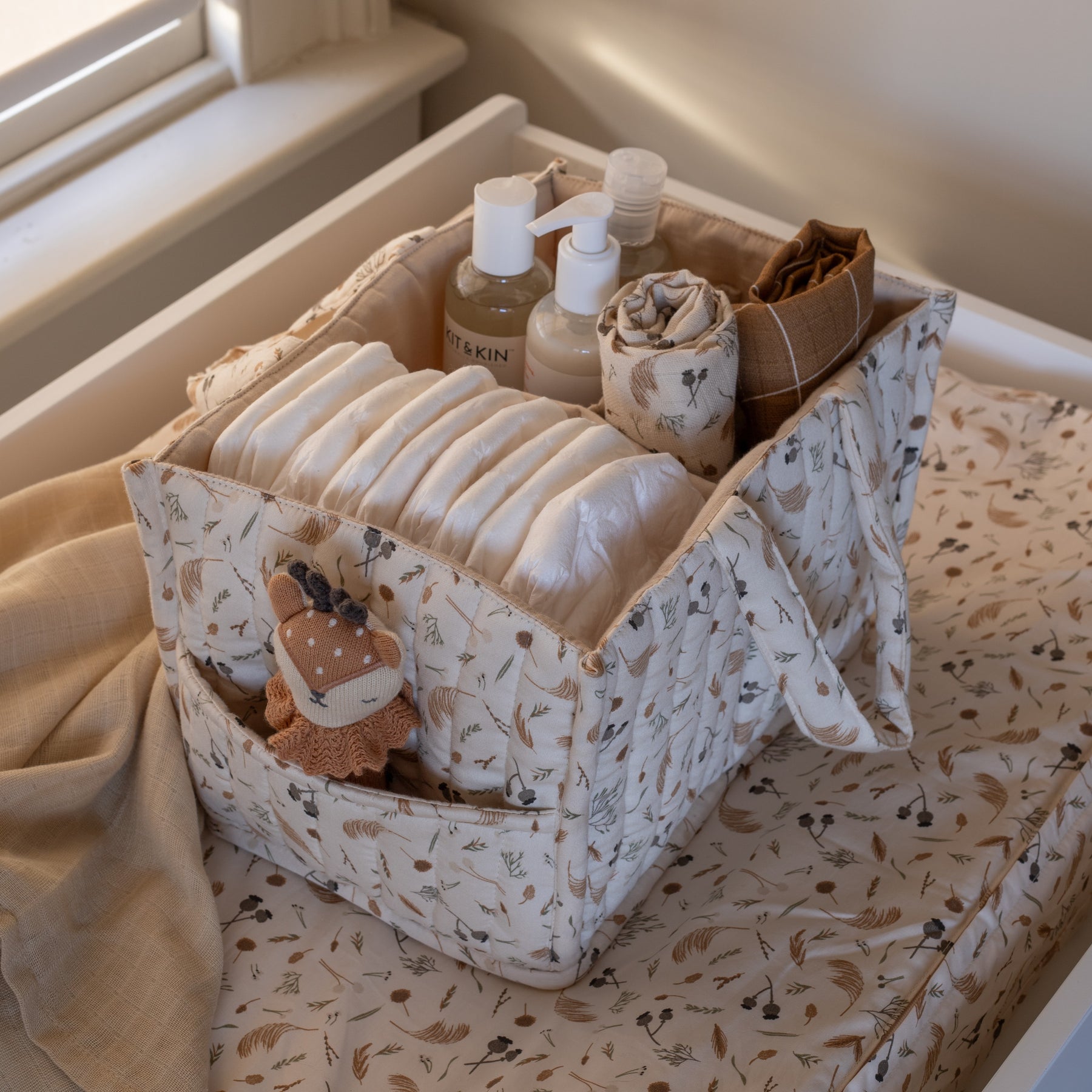 The perfect addition to your baby changing station. This Avery Row quilted nappy caddy has 2 outer pockets and 3 inner compartments, perfectly sized for storing nappies, creams and wipes. Handles make the caddy portable so your baby changing essentials can always be close to hand.