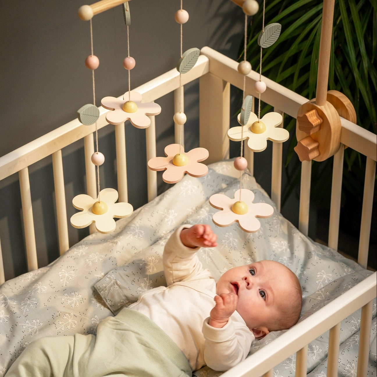 Jabadabado Flowers Cot Mobile is the perfect decoration to hang over the crib or changing table. The colourful flowers on the mobile stimulate the baby’s senses and movements in the early months. It also provides an extra moment of fun when changing diapers.