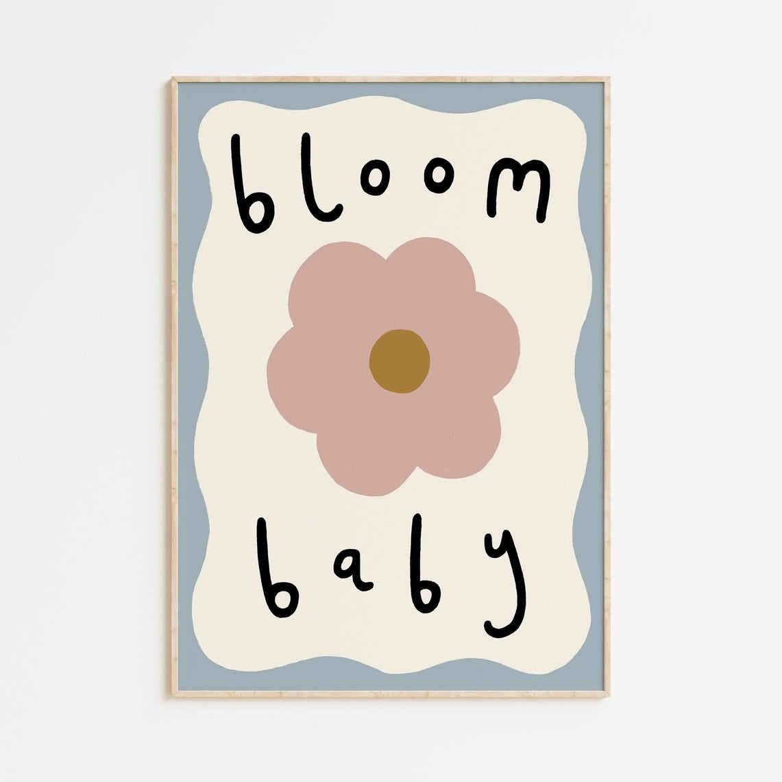 This bloom baby print showcases a digitally-drawn flower with a funky border and the phrase bloom baby in a playful font.