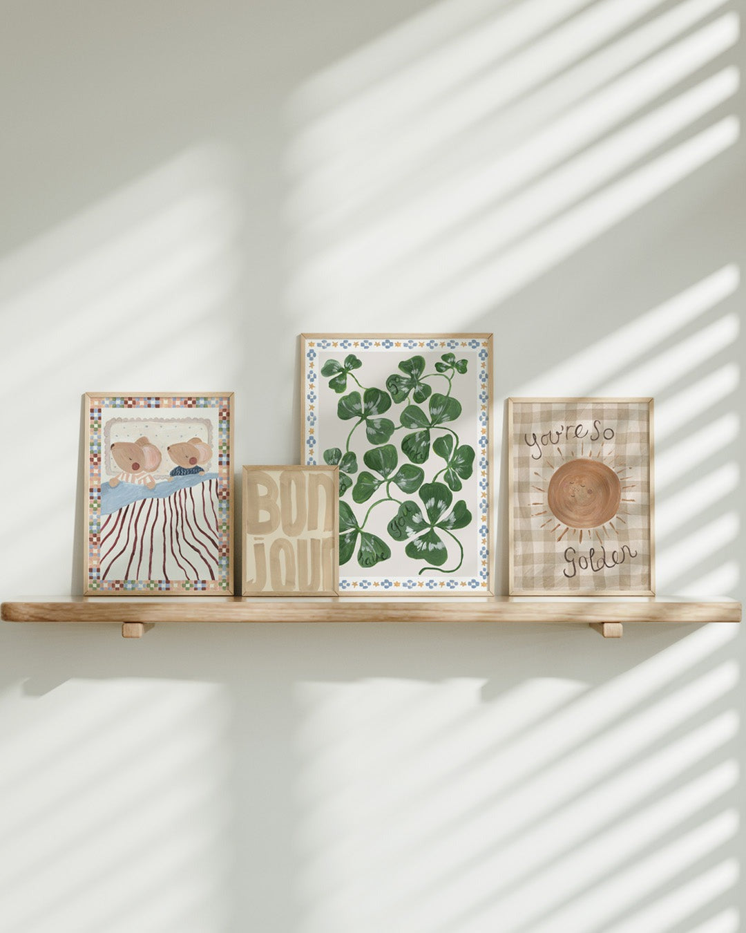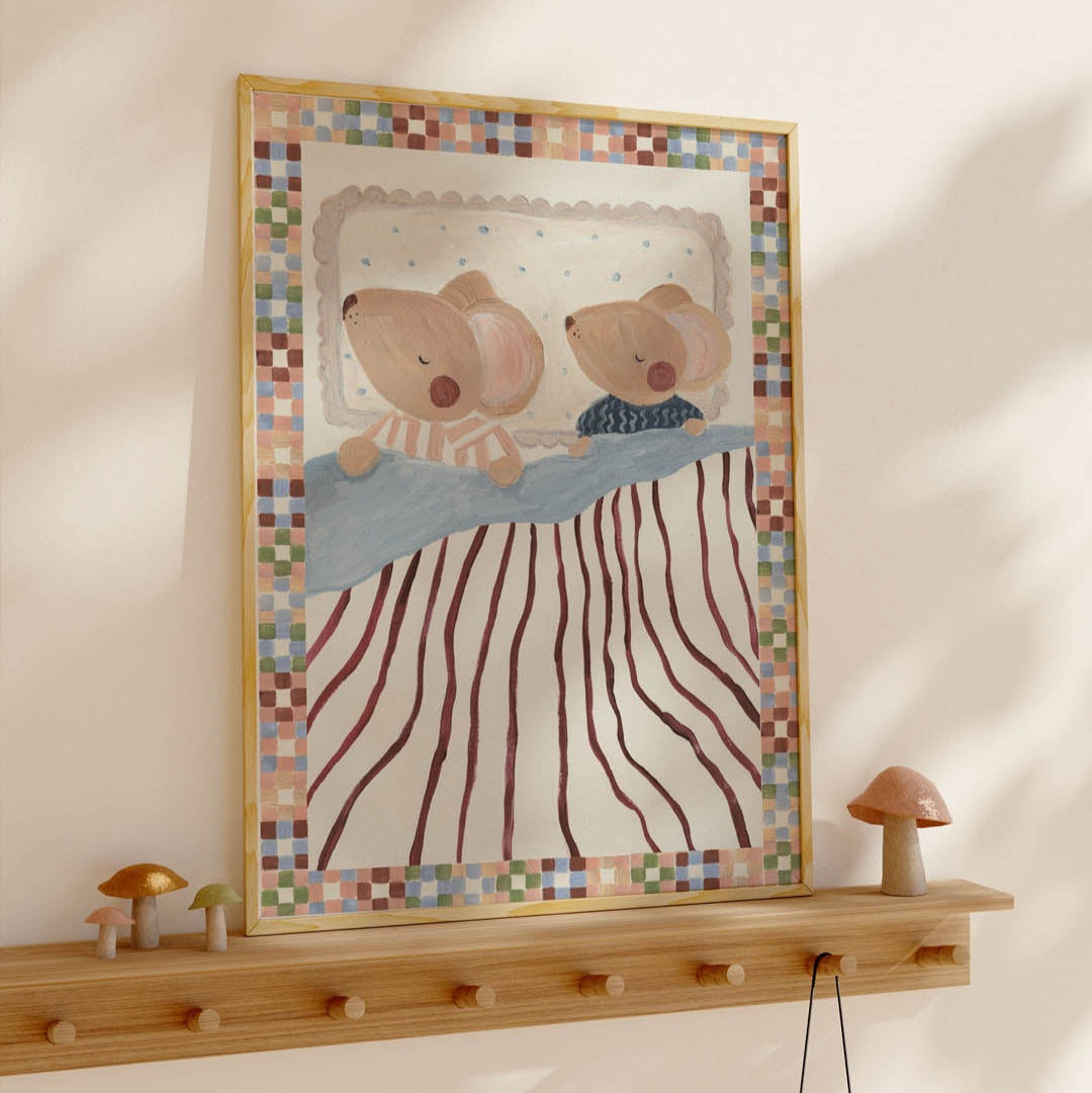 Transform your child's room into a whimsical wonderland with this hand-painted print. The charming pastel checkerboard border and peacefully sleeping mice will add warmth and coziness to their space. Enhance their sense of wonder and comfort with this unique piece of art!