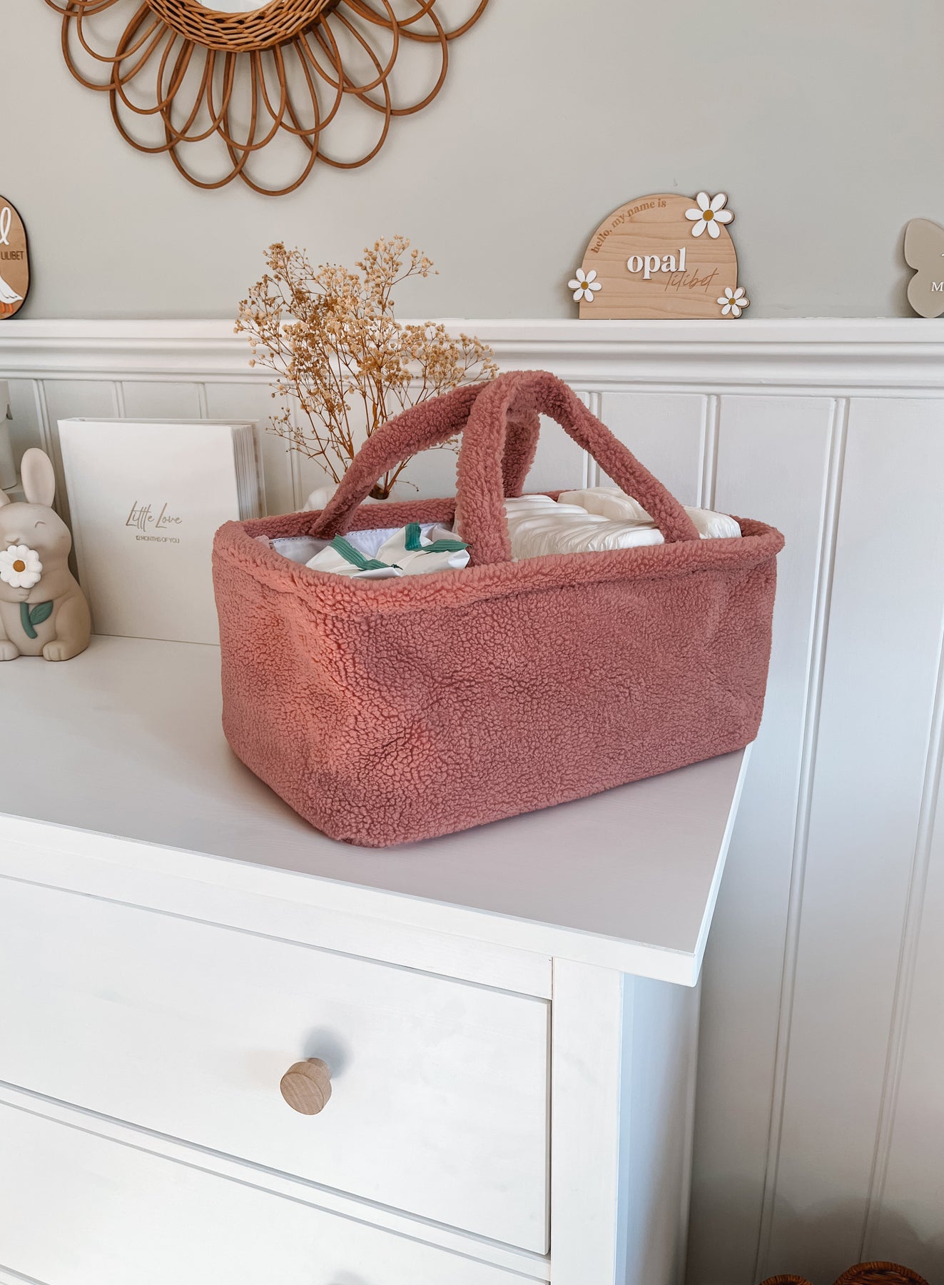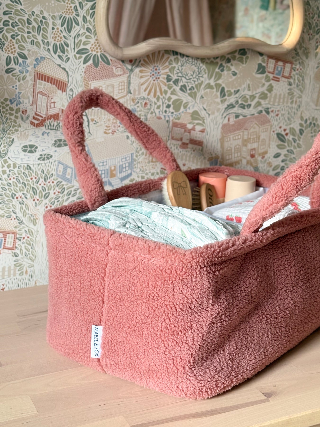 Stay organized and stylish with the Mabel & Fox Teddy Nappy Caddy in Rose Pink. With generous storage space and interchangeable dividers, you can keep all your baby changing essentials in arms reach.