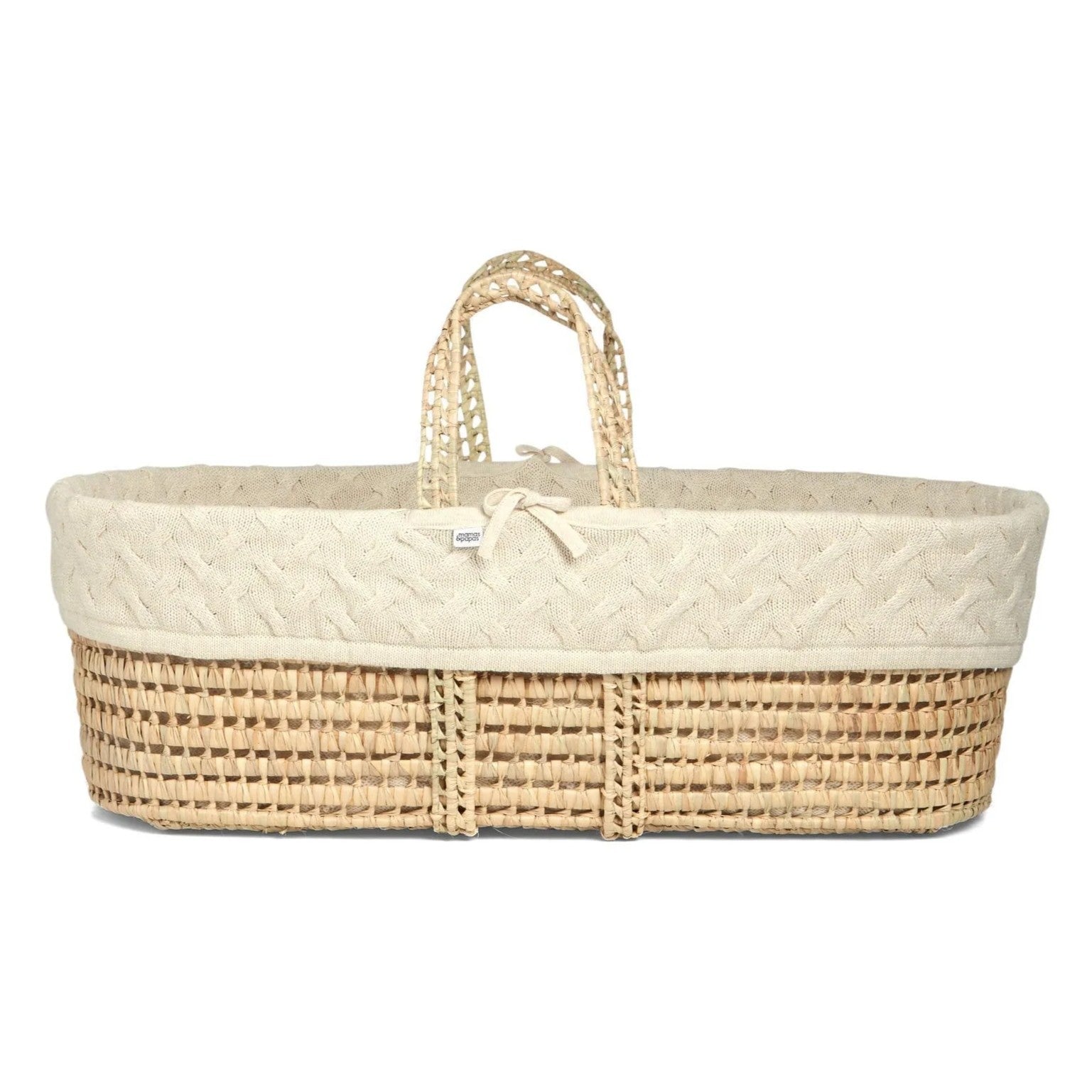 This Moses basket, made from natural palm, features the range's classic neutral colors. It's decked out in a thick cable knit liner, created from a deliciously creamy marled yarn.