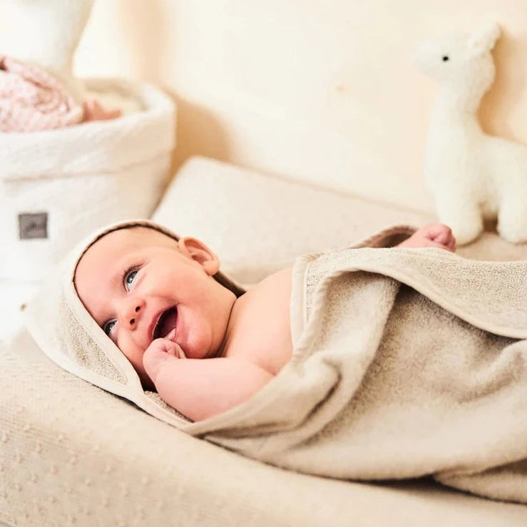 The bath cape is also perfect to bring to the beach in the summer. The hood has a practical loop, so you can hang it up after use.