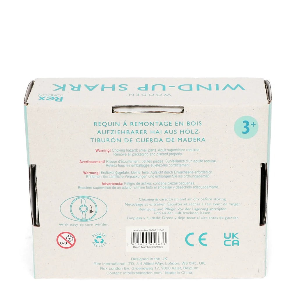 un wind-up swimming shark toy for childre by Rex London, that can be played with in the bath or paddling pool. After winding up the clockwork mechanism with the easy to turn winder, then releasing in the water, the shark will propel itself forwards.