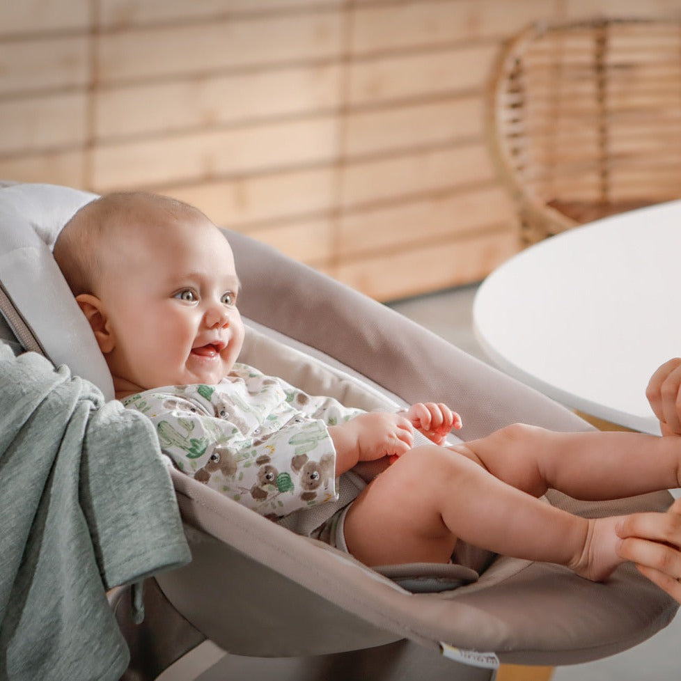 The fully adjustable 3-point waist harness ensures maximum safety for your little baby. The Deluxe Bouncer can be easily combined with the Alpha+ or Beta+ Wooden Highchairs (not included) to create a unique 2 in 1 long lasting package for feeding, playing, or sleeping, suitable from birth.