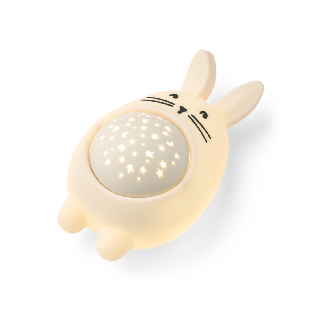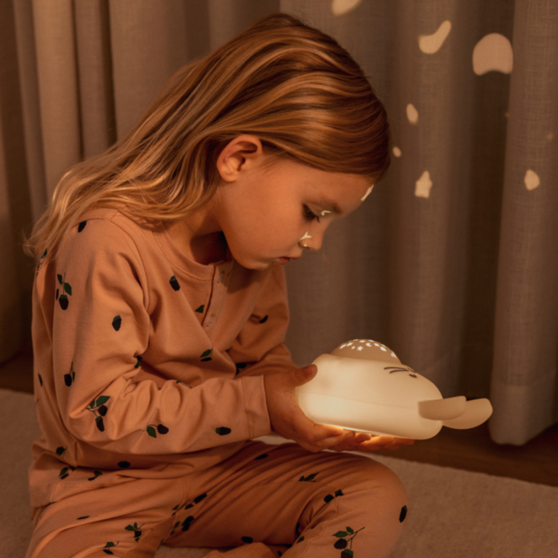 Meet your little one’s new bedtime buddy—a cosy rabbit that doubles as a nightlight projector and sound spa. This charming lamp fills the room with a starry sky featuring Liewood characters while playing one of eight calming sounds, from heartbeat to ocean waves. Recharge easily with the included USB-C cable. Perfect for creating a soothing sleep environment!