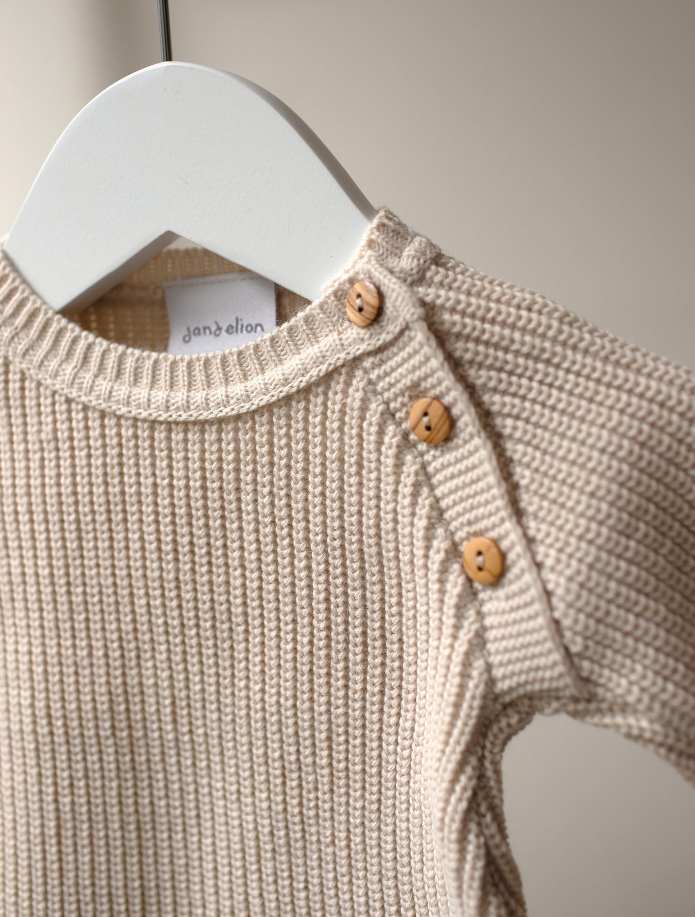 Wrap your little one in cosy comfort with this taupe knitted romper from Mabel & Fox. Crafted from super soft material, it’s perfect for snuggly home days or playful adventures outside. Three charming wooden buttons add a touch of natural style while making dressing up a breeze. Ideal for keeping your child comfy and cute all day long!
