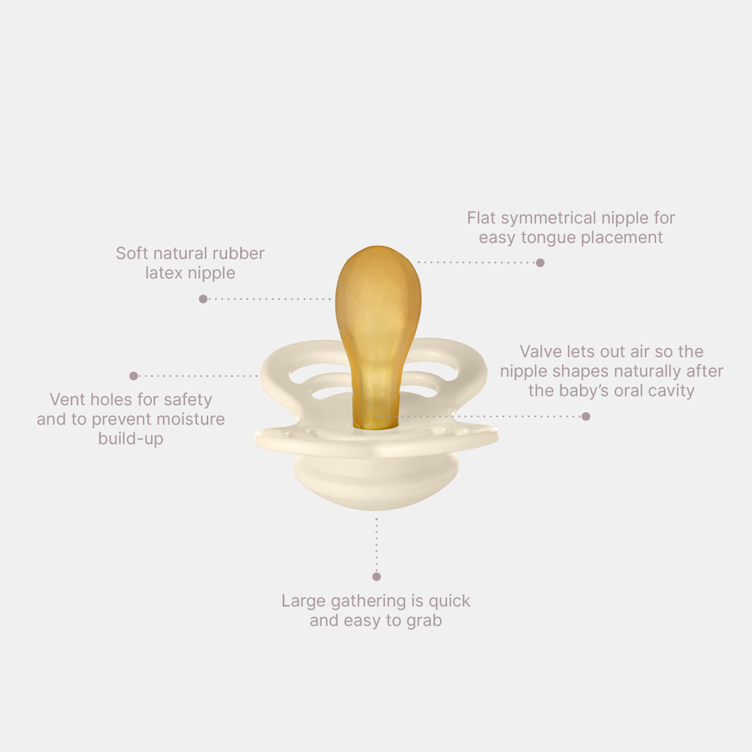 Included: Two supreme pacifiers with a symmetrical nipple, one in ivory and the other in sage.