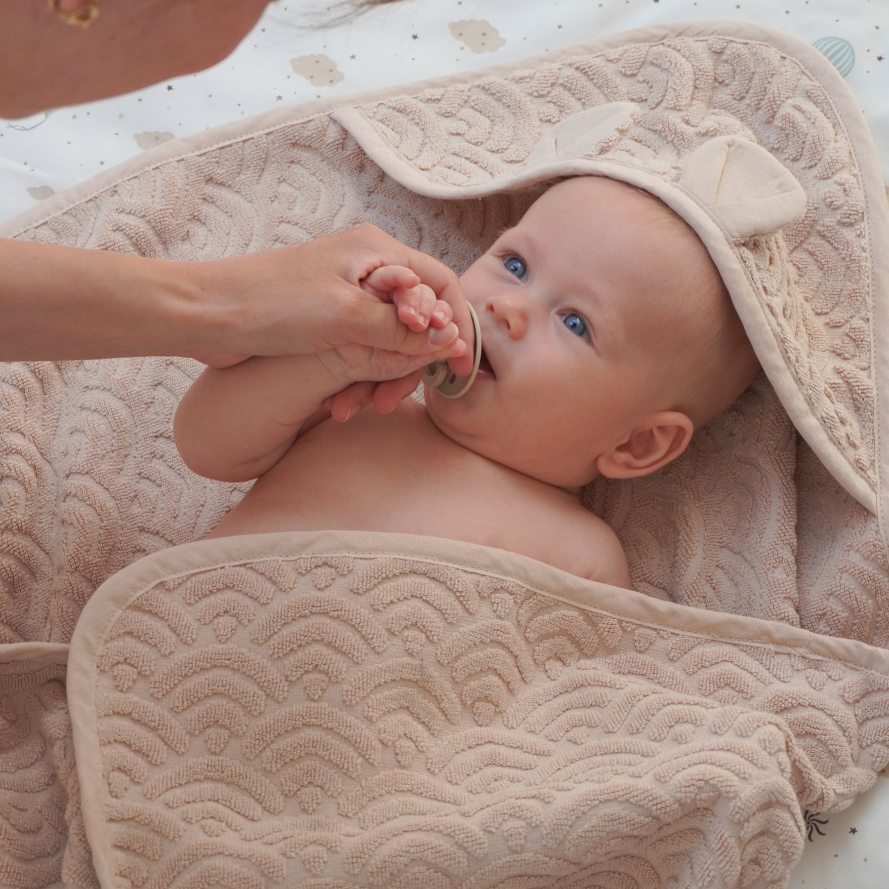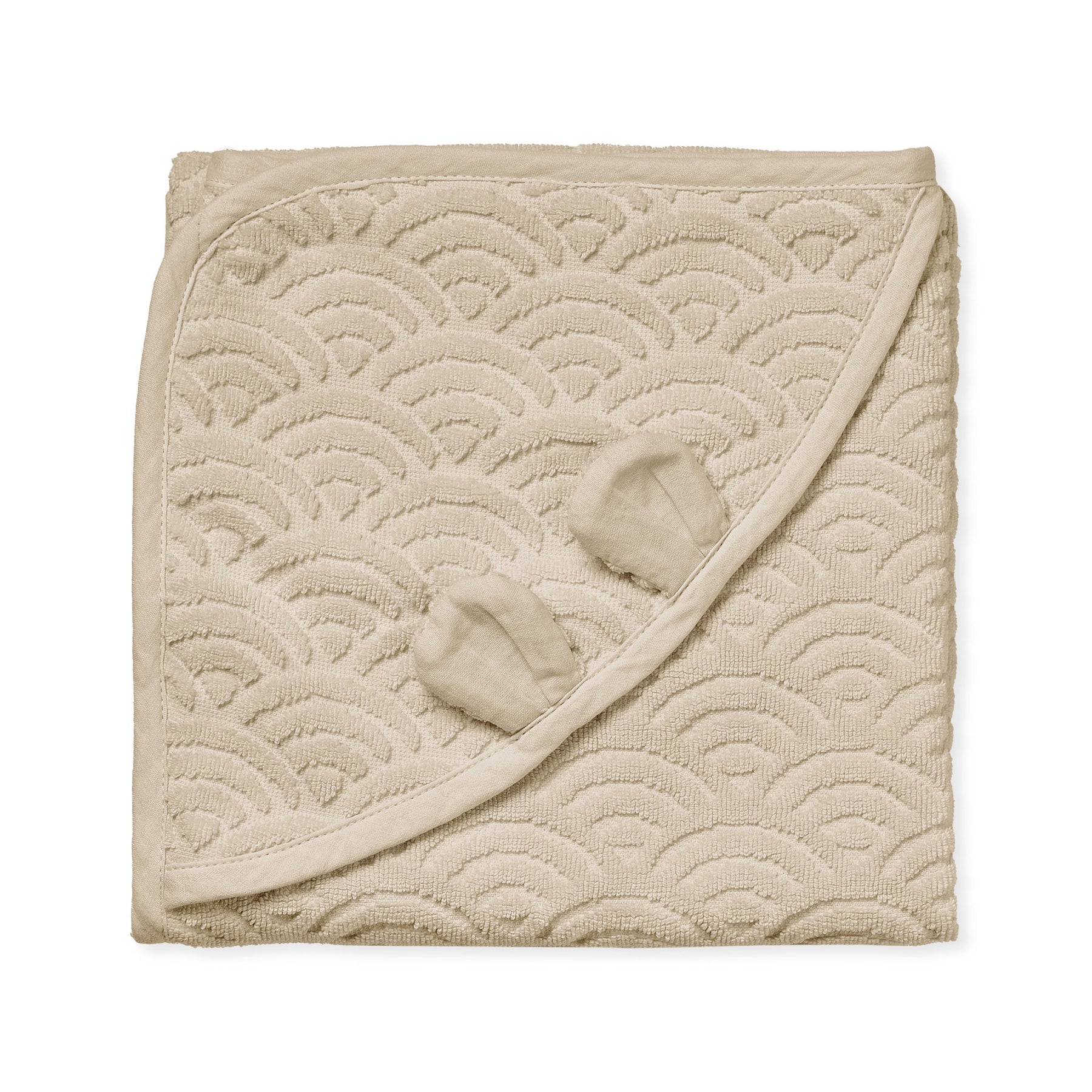 Soft, lush, and thick Baby Towel made from 100% GOTS-certified organic cotton and woven in the iconic Cam Cam wave pattern. The towel has a small hood with the cutest little bear ears and is perfect for snuggling after a warm bath. The airy wave pattern makes the towel fast drying.