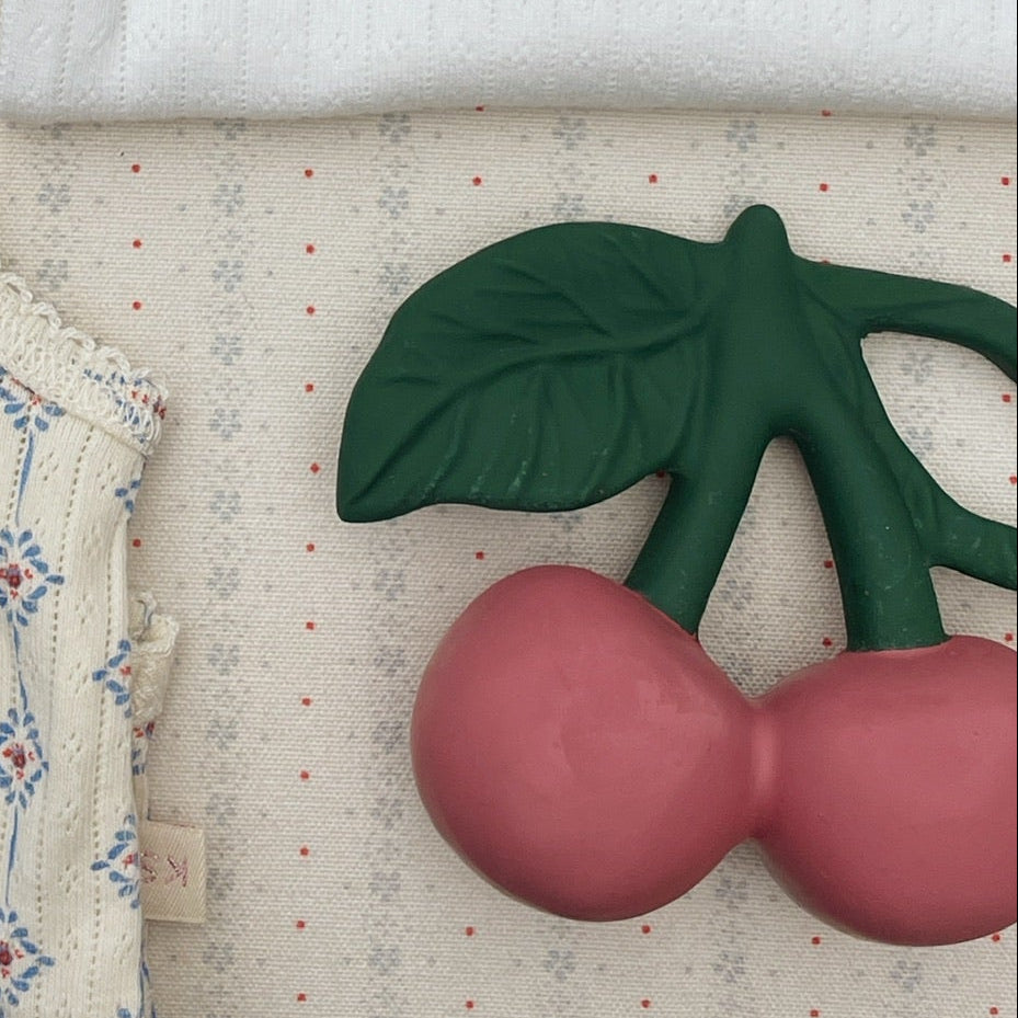 Cute little teether toy made in Konges Slojd's signature cherry design that is easy for little hands to grab and hold.