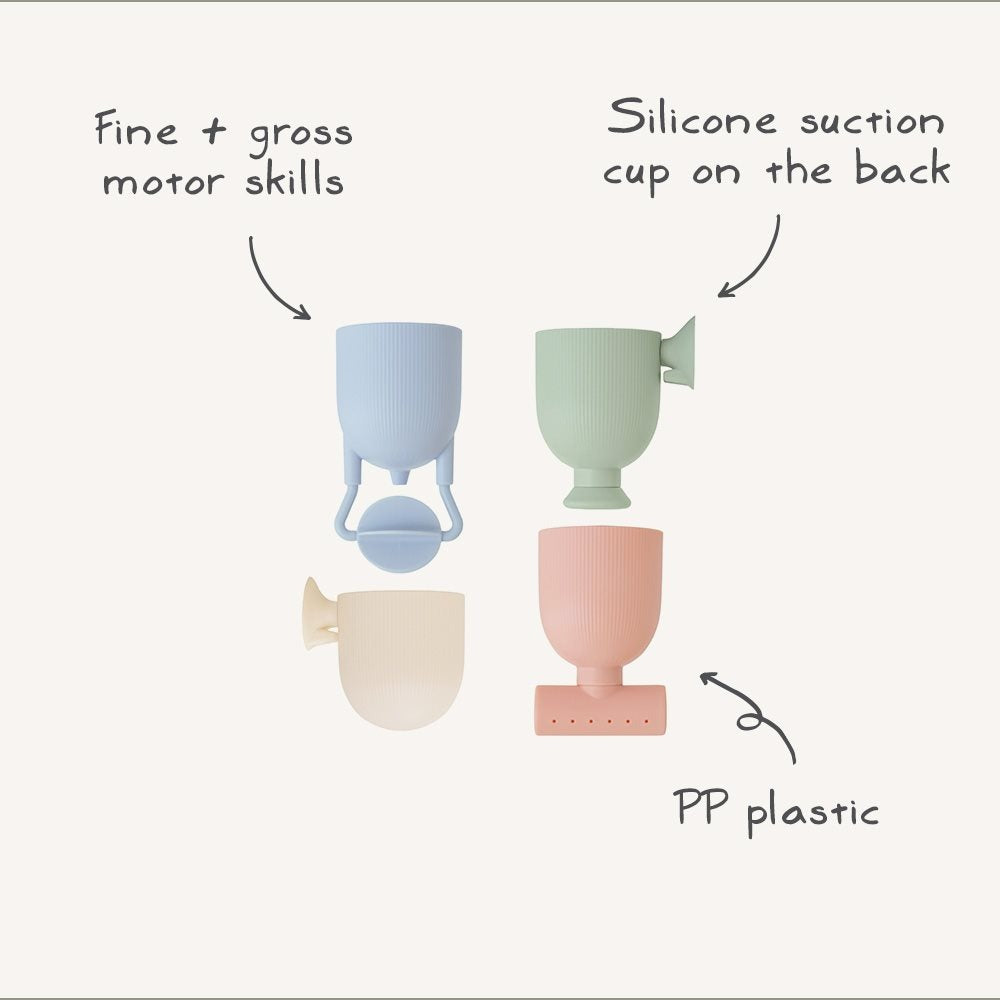 Turn bath time into an exciting adventure with the Mushie Pour & Play Bath Set. Perfectly sized for little hands, this fun toy sparks creativity and sensory exploration. Each cup has a silicone suction cup on the back, so kids can stick them to the tub and design their own waterfalls. With different shaped openings, the cups create unique water flows, and the included pour cup adds even more playful possibilities. Made from safe, non-toxic materials, this durable set features soft, calming colors that make bath time relaxing and enjoyable for both kids and parents.