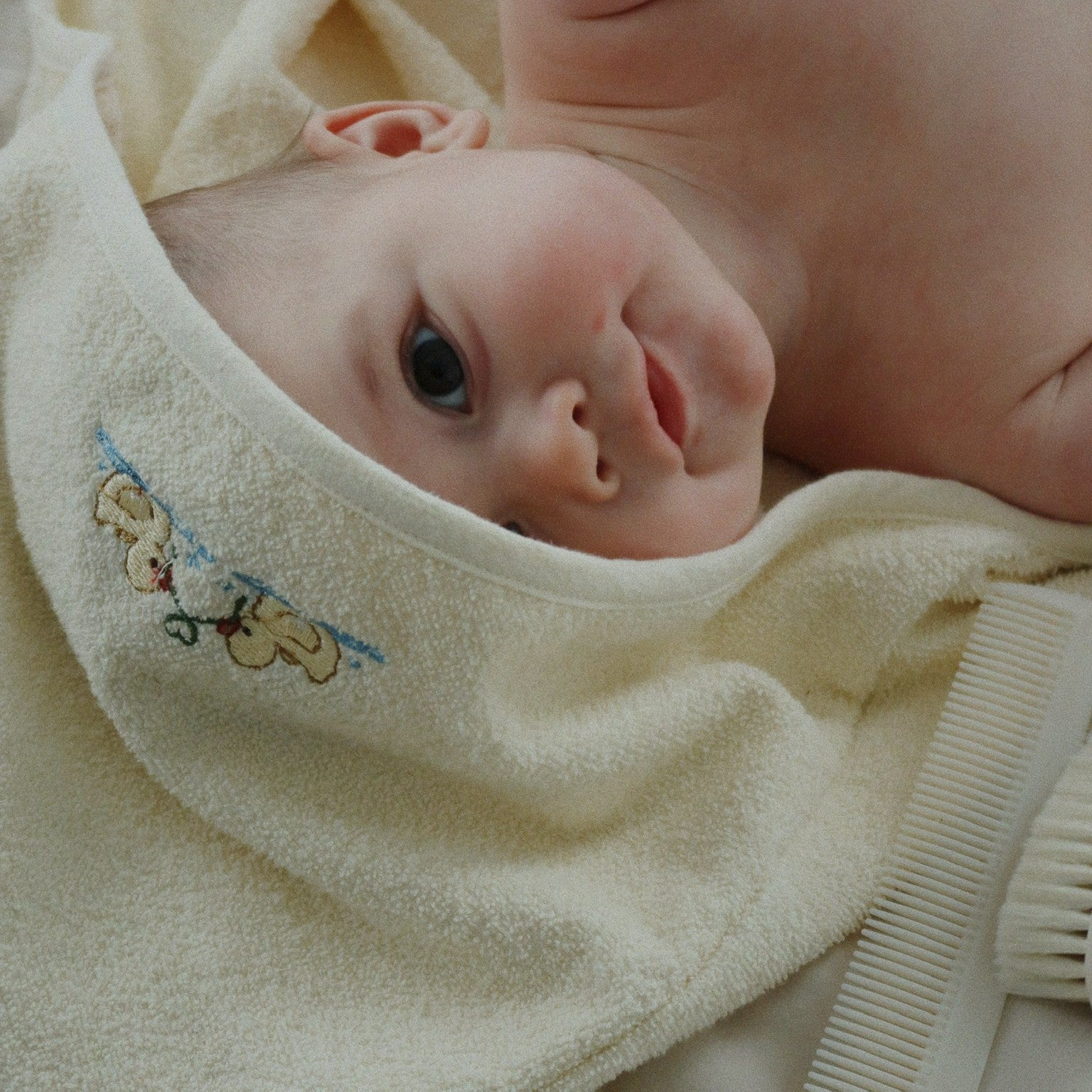 Soft baby towel woven in a heavy organic terry cotton. Wrap your baby in the soft towel and gently rub them dry while massaging their little hands and feet. It's the perfect soothing post-bath ritual that is soothing for both baby and parents