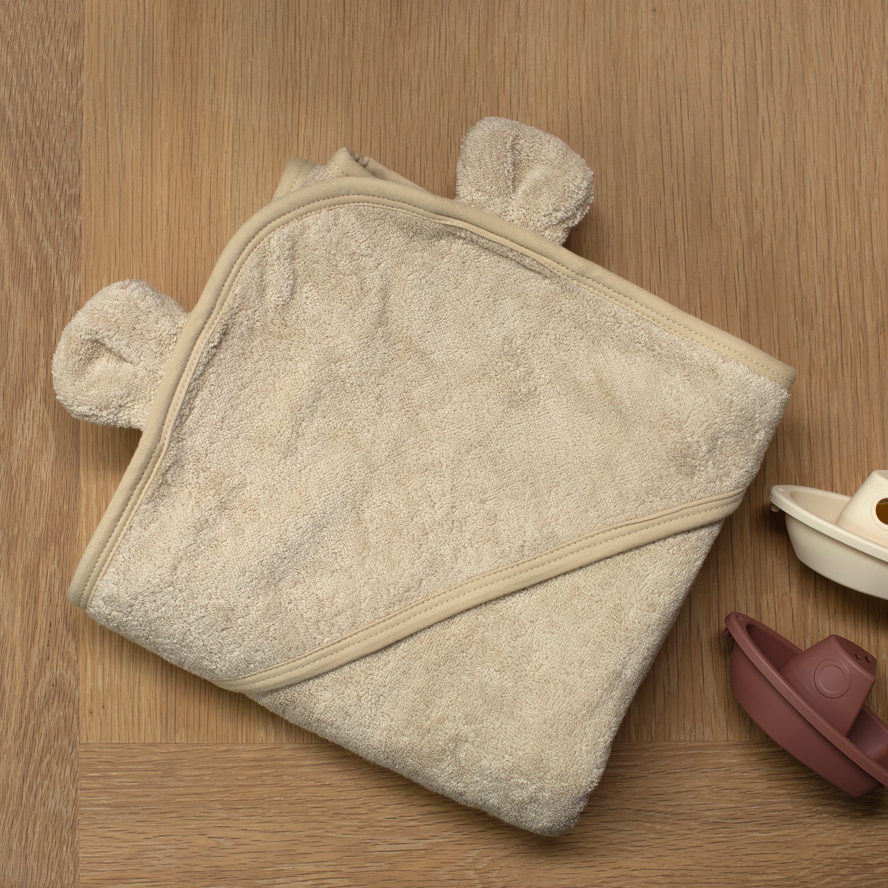 Featuring an adorable hood with cute little ears and a stylish neutral beige colour, it brings both style and practicality to your bath time routine. Perfect for keeping your baby cosy from head to toe - bath time never looked so sweet!