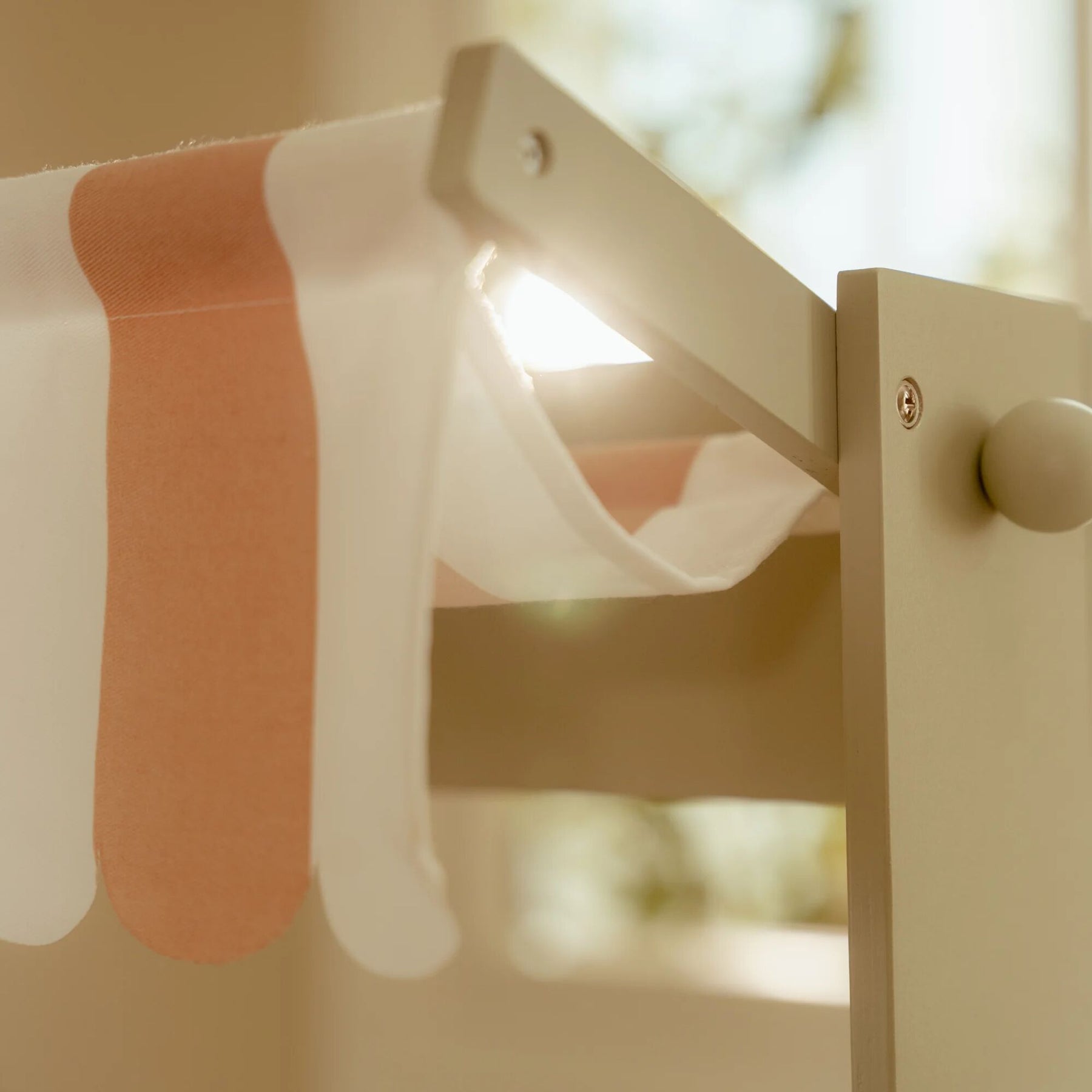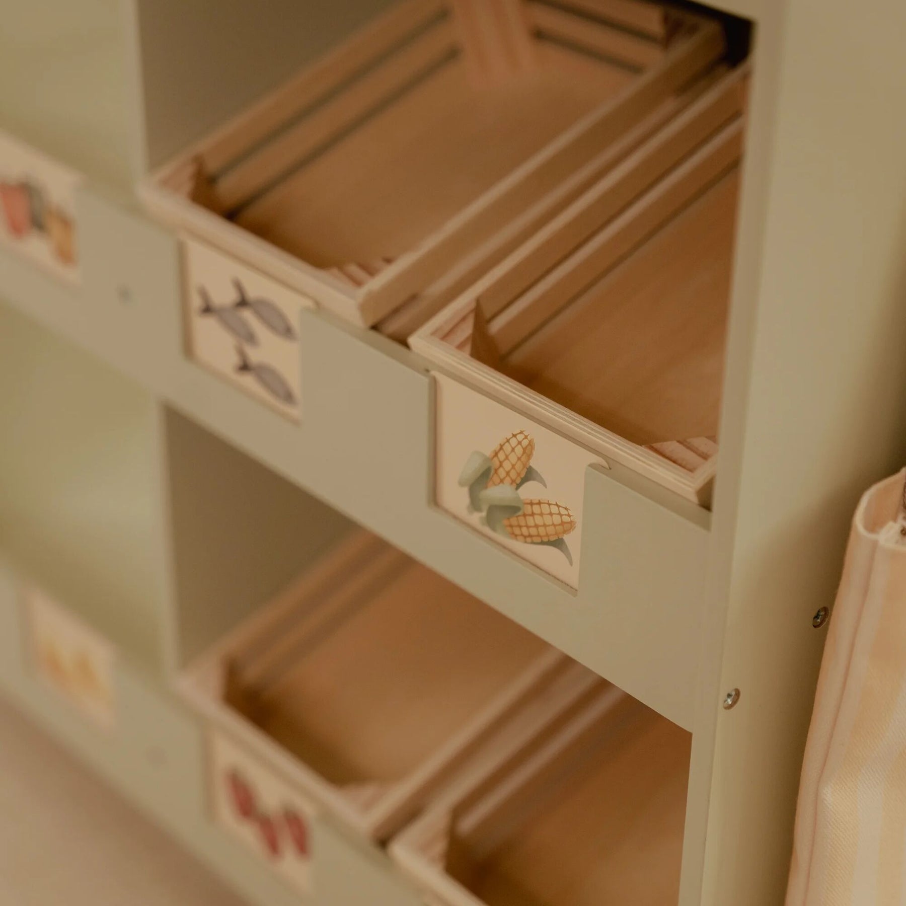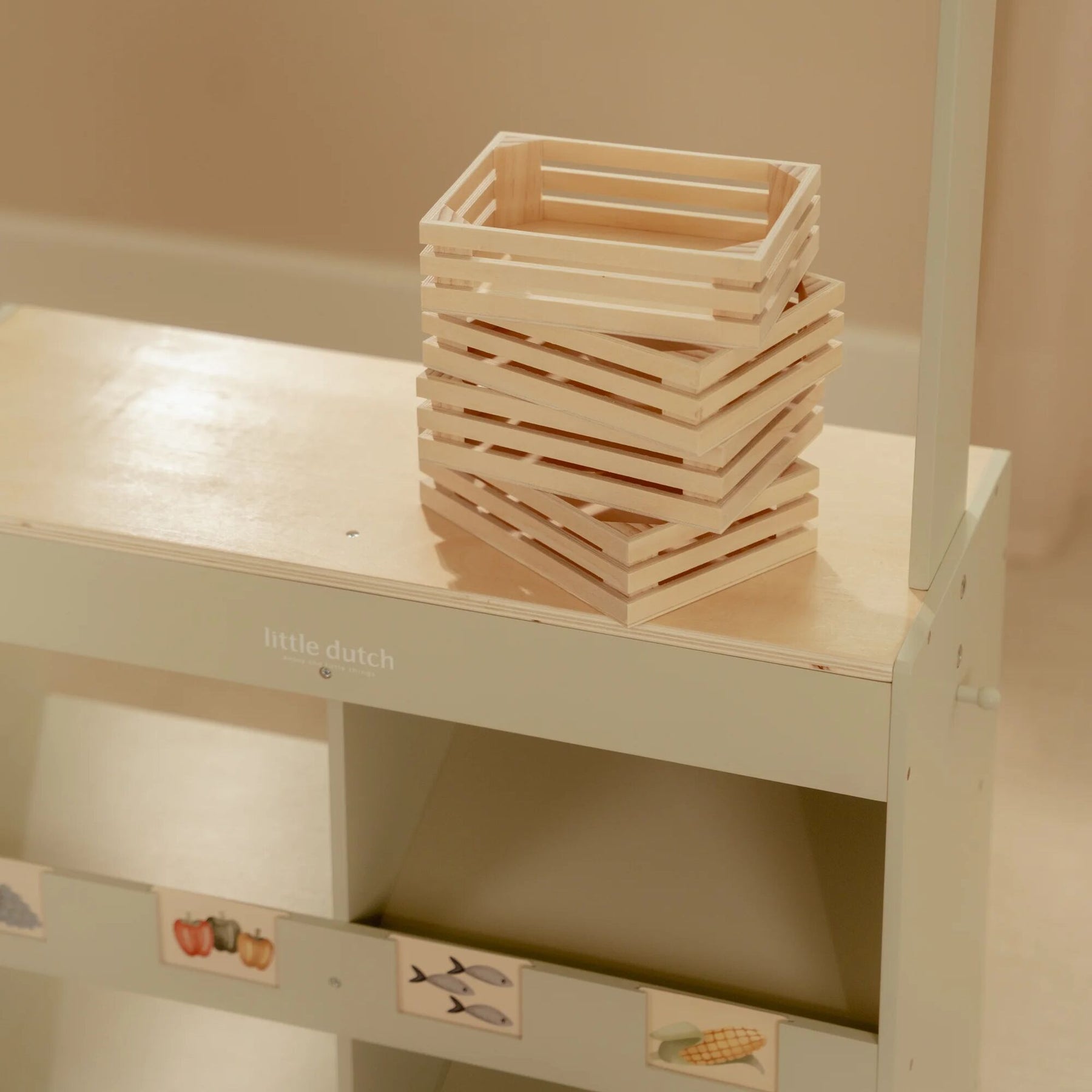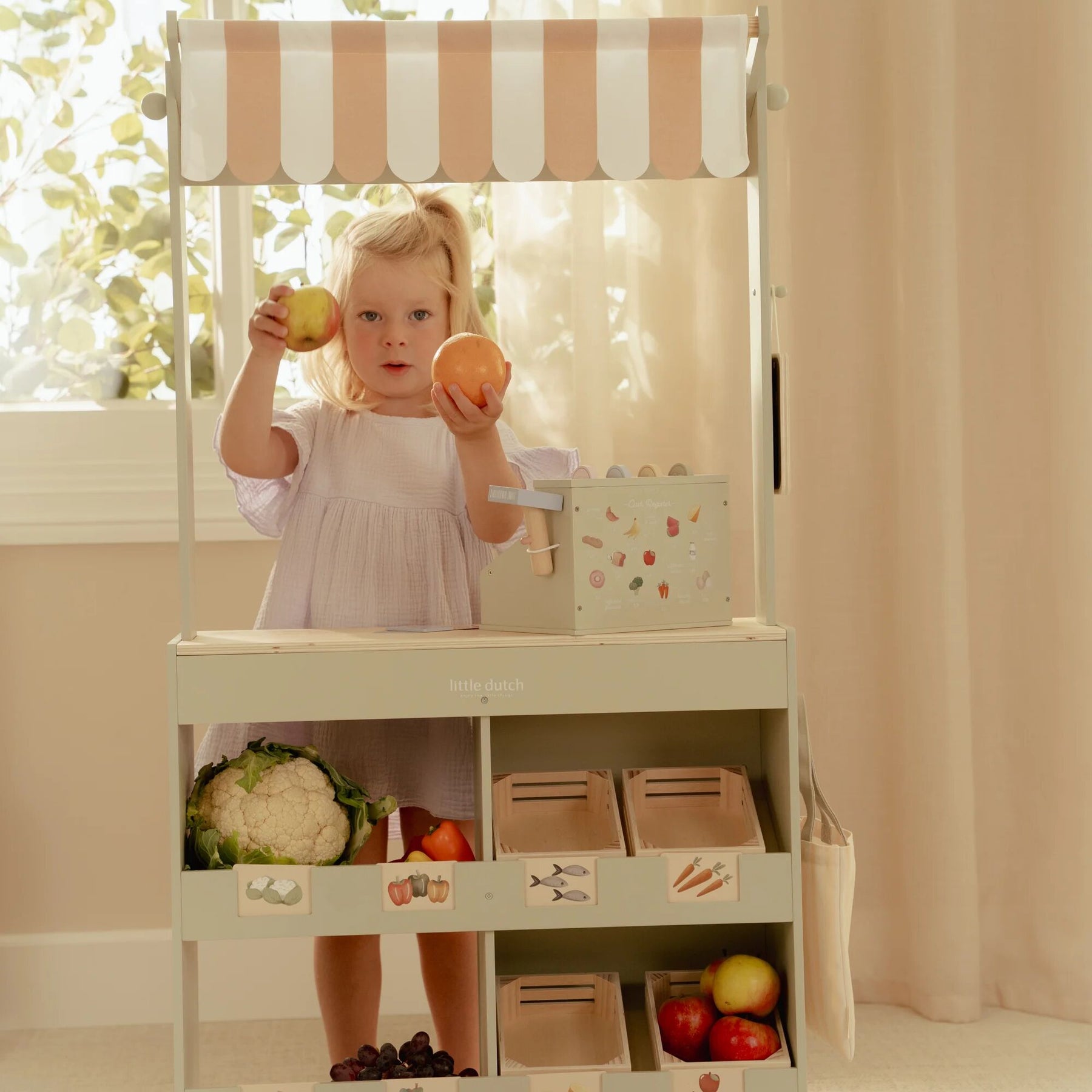 With this beautiful wooden market stall, children can play shop in their own little store. The fabric canopy creates an authentic market atmosphere, and with the chalkboard and illustrated cards, they can display their products nicely. The set also includes a shopping bag and crates for a real shopping experience.