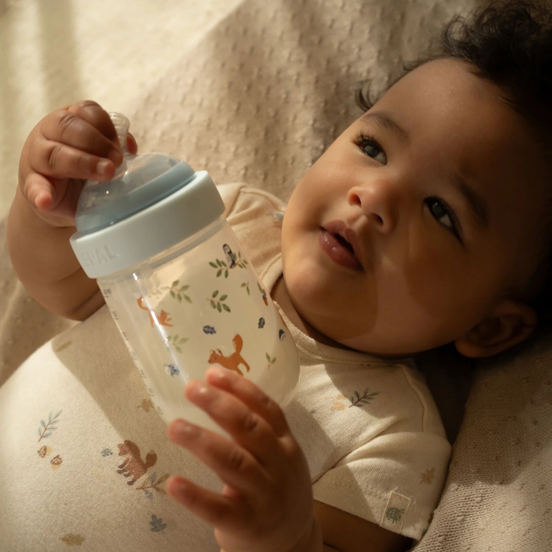 Enjoy cosy feeding moments with the 240ml Mepal Mio baby bottle, decorated with Little Dutch’s dreamy Forest Friends print.