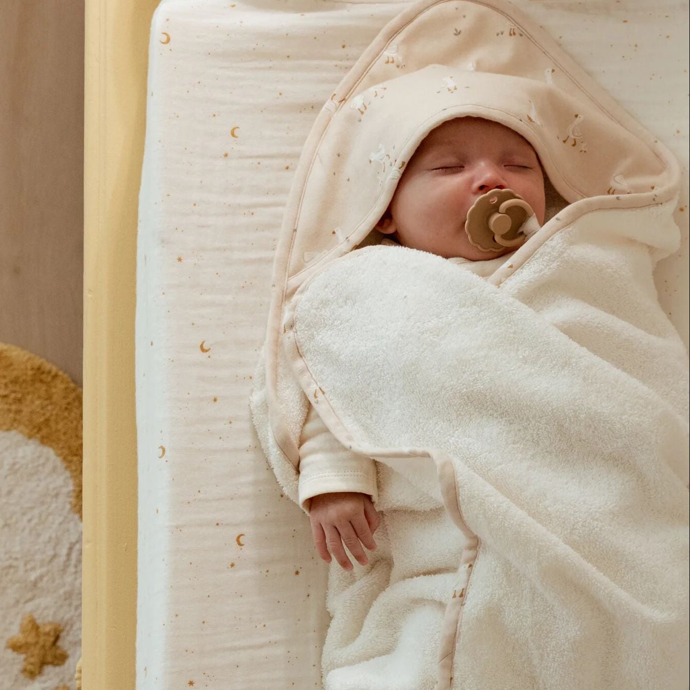 Crafted from sumptuous, premium fabrics, it wraps your baby in softness and comfort during those frequent changes. The whimsical Moon & Stars design transforms your nursery into a charming space while keeping things light-hearted and fun. Practicality meets style—simply toss it in the wash whenever spills and mishaps occur (and they will!). Universal fit means it works beautifully on all standard changing mats, making it the perfect blend of function and flair for modern parents.