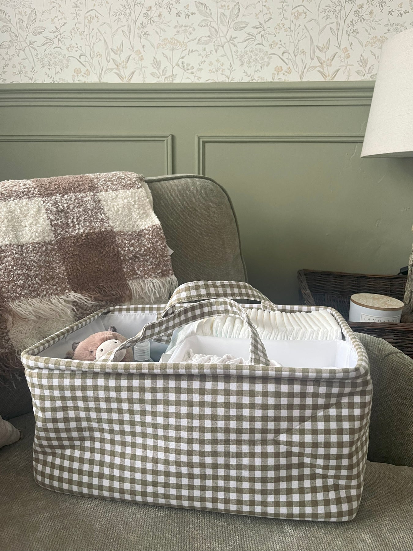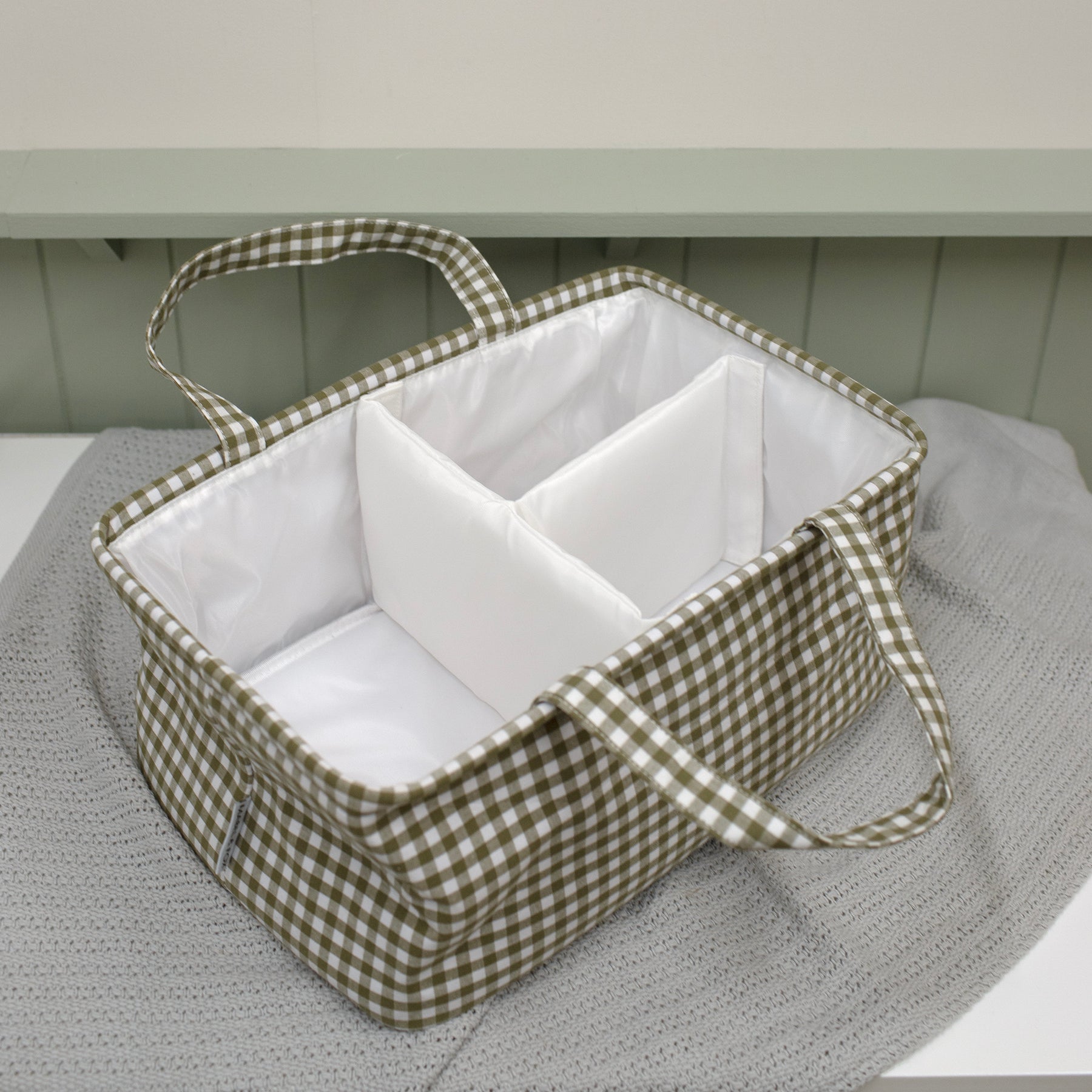 Stay organized and stylish with the Mabel & Fox Gingham Nappy Caddy in Green. With generous storage space and interchangeable dividers, you can keep all your baby changing essentials in arms reach.