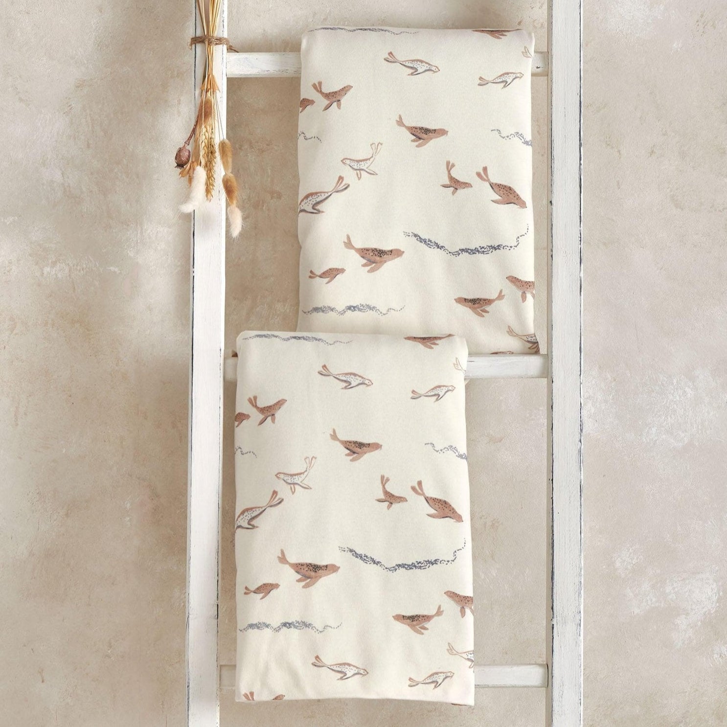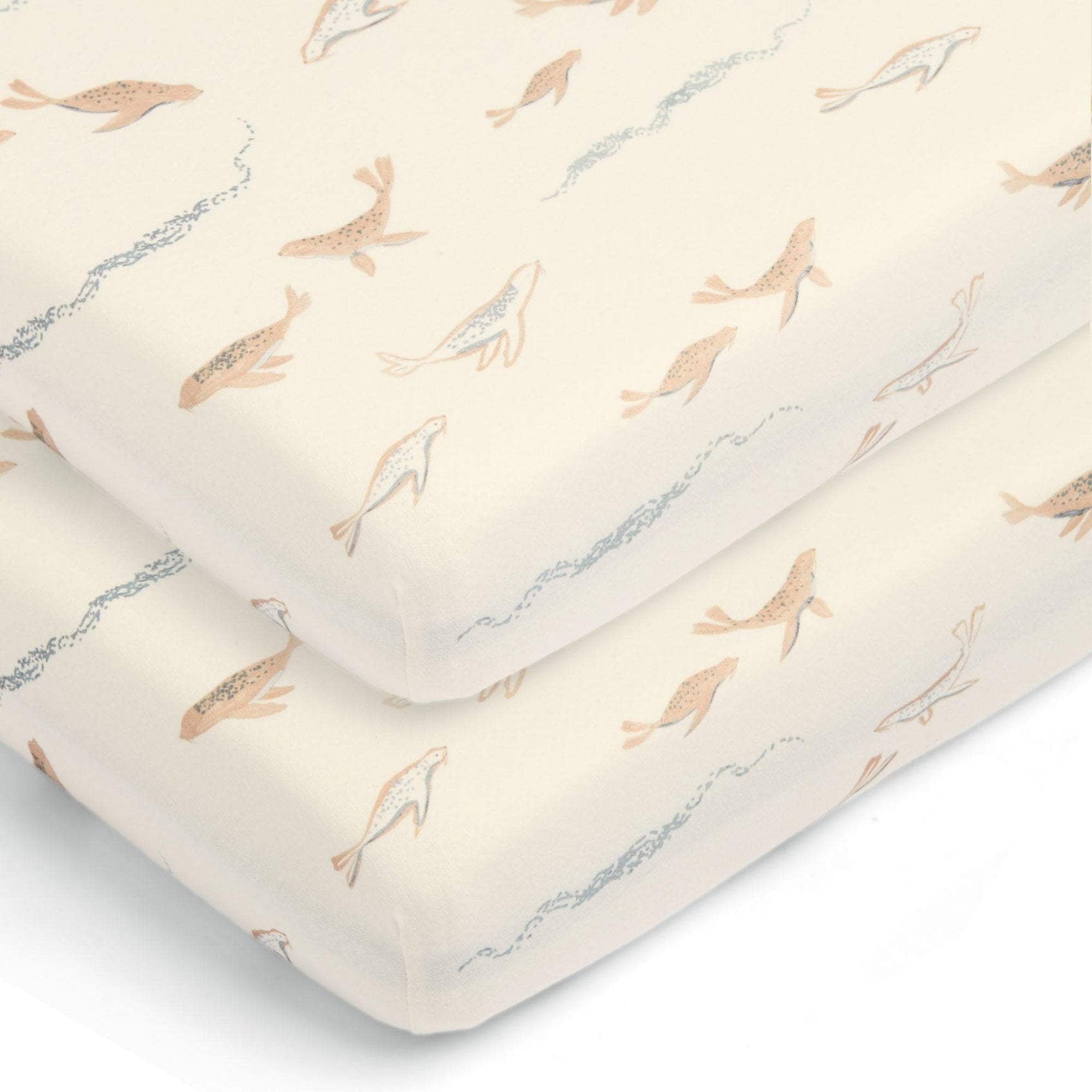 This 2-pack of cozy fitted sheets showcases a sweet seal print, hand-drawn with soft shades of brown and ocean blue. Made from 100% cotton, they’re designed to fit cotbed mattresses snugly and add a splash of ocean fun to naptime.