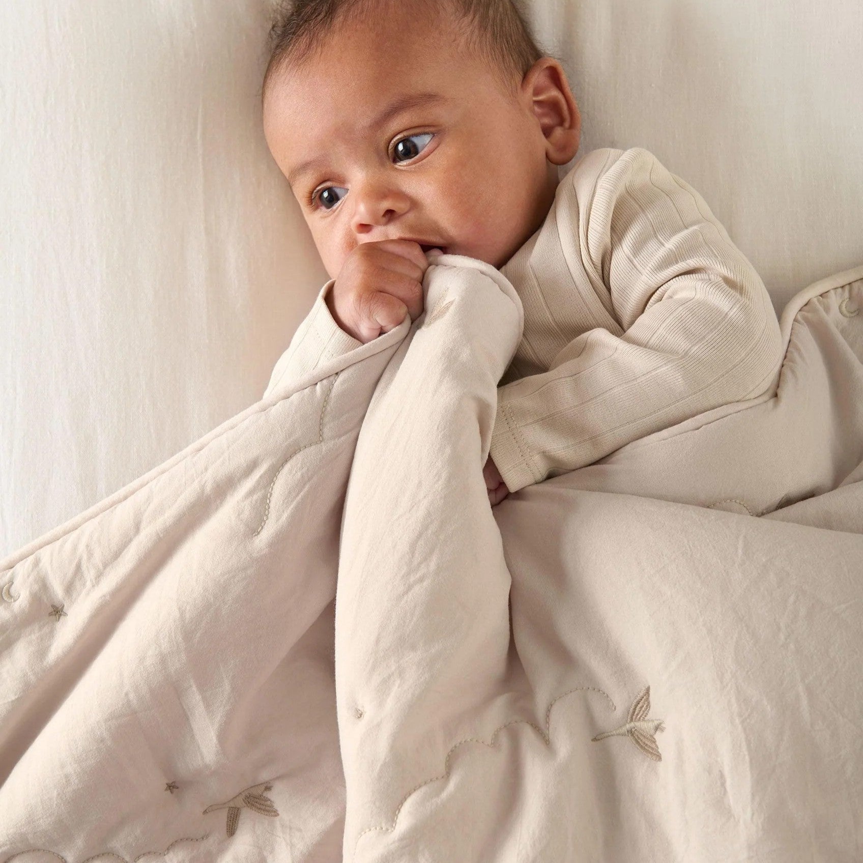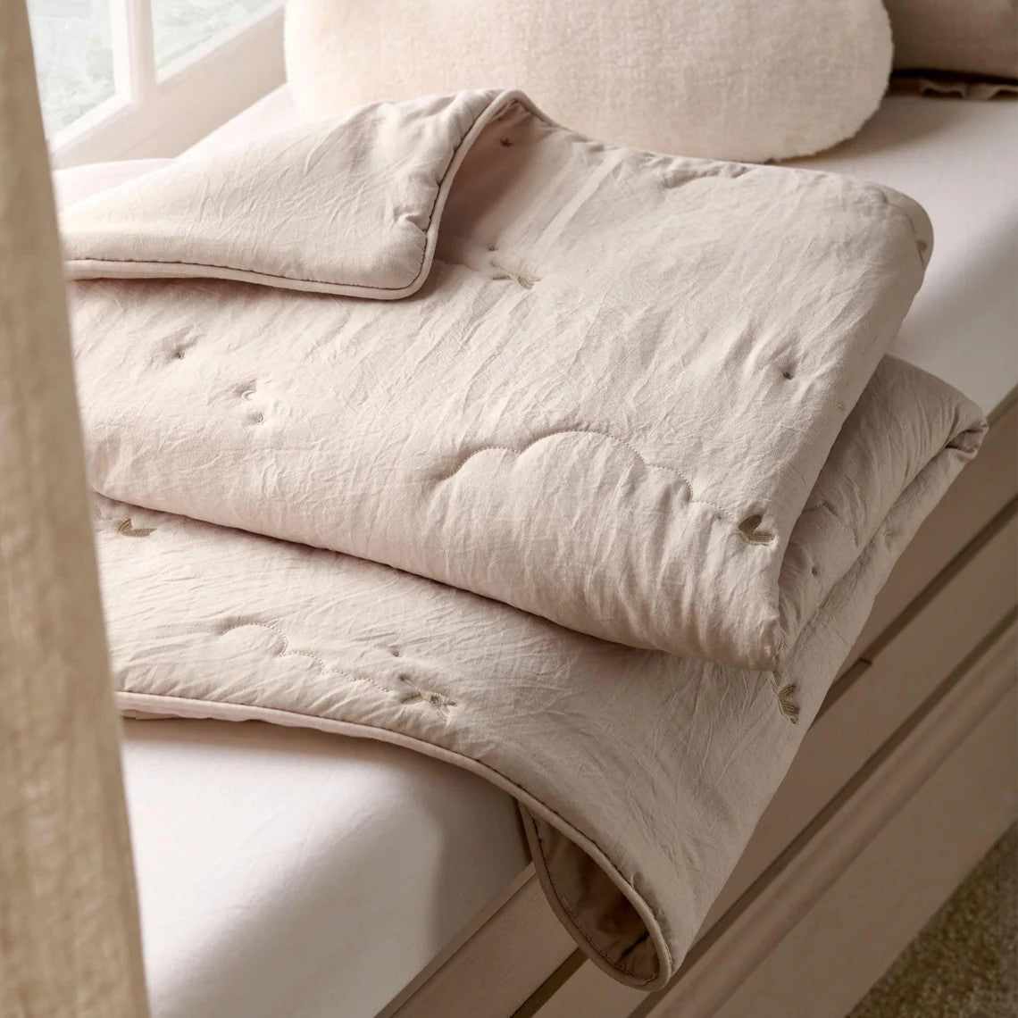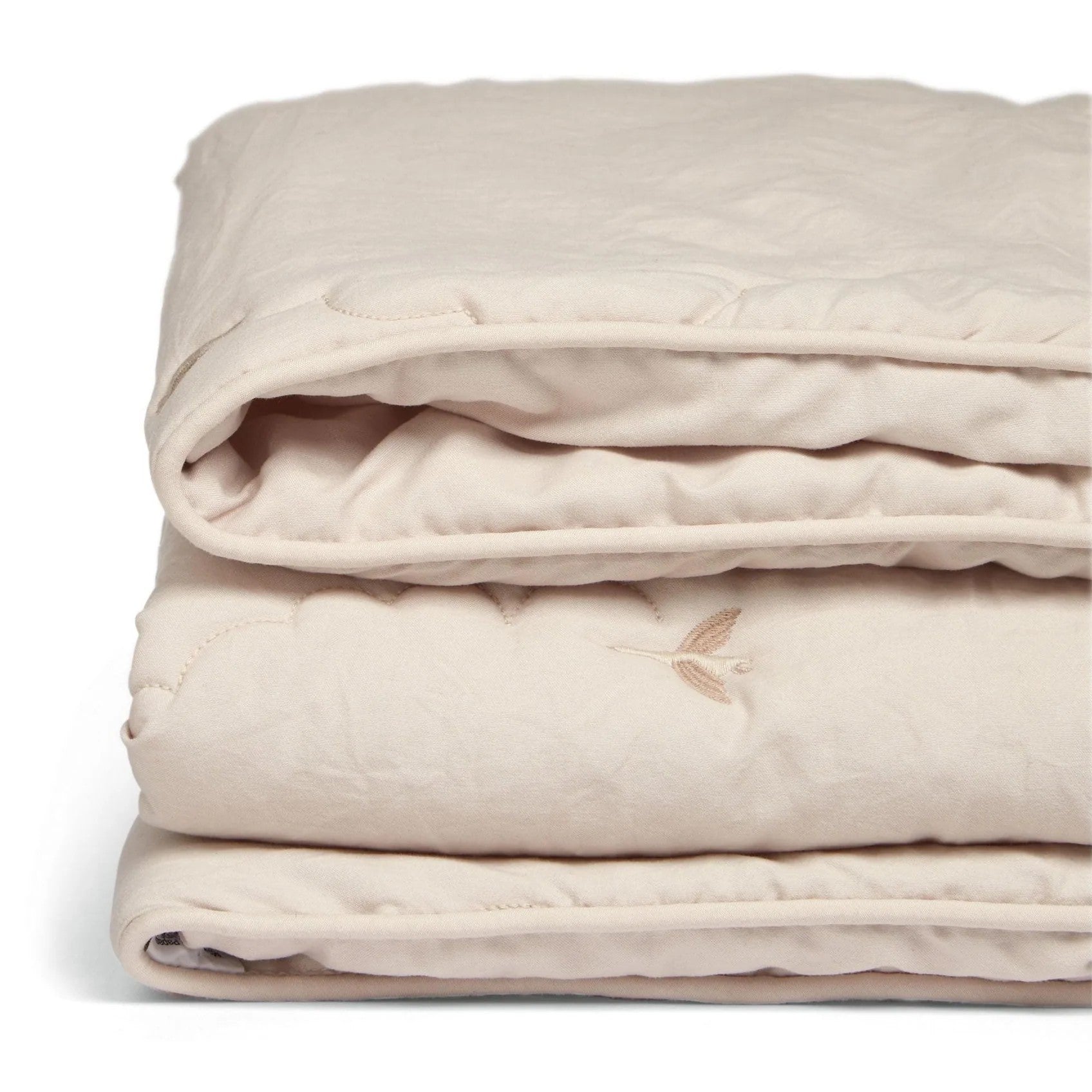 A soft, lofty laundered-feel 4.0 Tog quilt with delicate cloud quilting and 'flying duck' embroidery. With a neutral base this quilt sits effortlessly in most nurseries and is finished with deluxe piped edging! A timeless design!