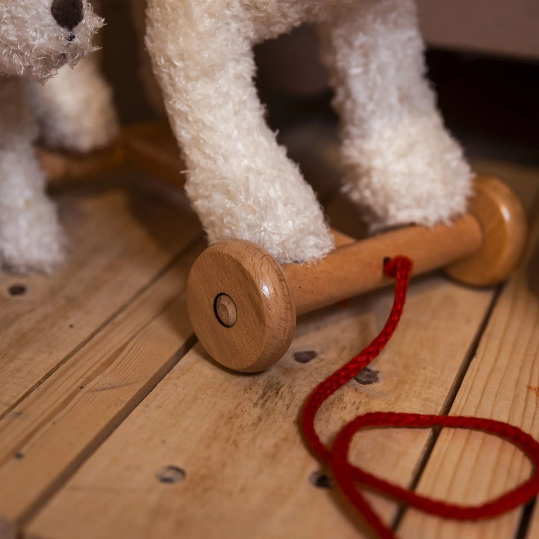 Little ones develop coordination whilst pulling their new friend around. Hand-finished wooden wheels and plush fur create a toy that's built to last through countless journeys together.