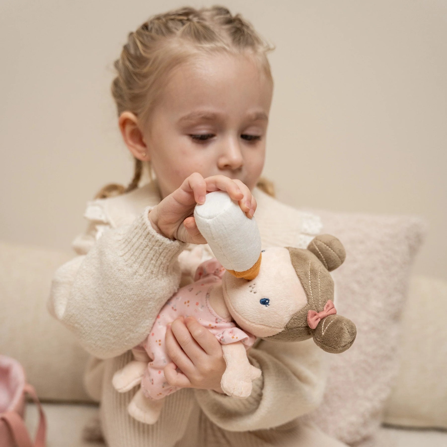 This cute Little Dutch Rosa plush doll loves to be cuddled and carried around. Baby Rosa will become friends with every little child. They can feed her with the bottle or calm her down with the dummy. They can change her nappy, put on a cap, and tuck her in with a blanket. Baby Rosa also enjoys going on a trip in his cute travel basket.