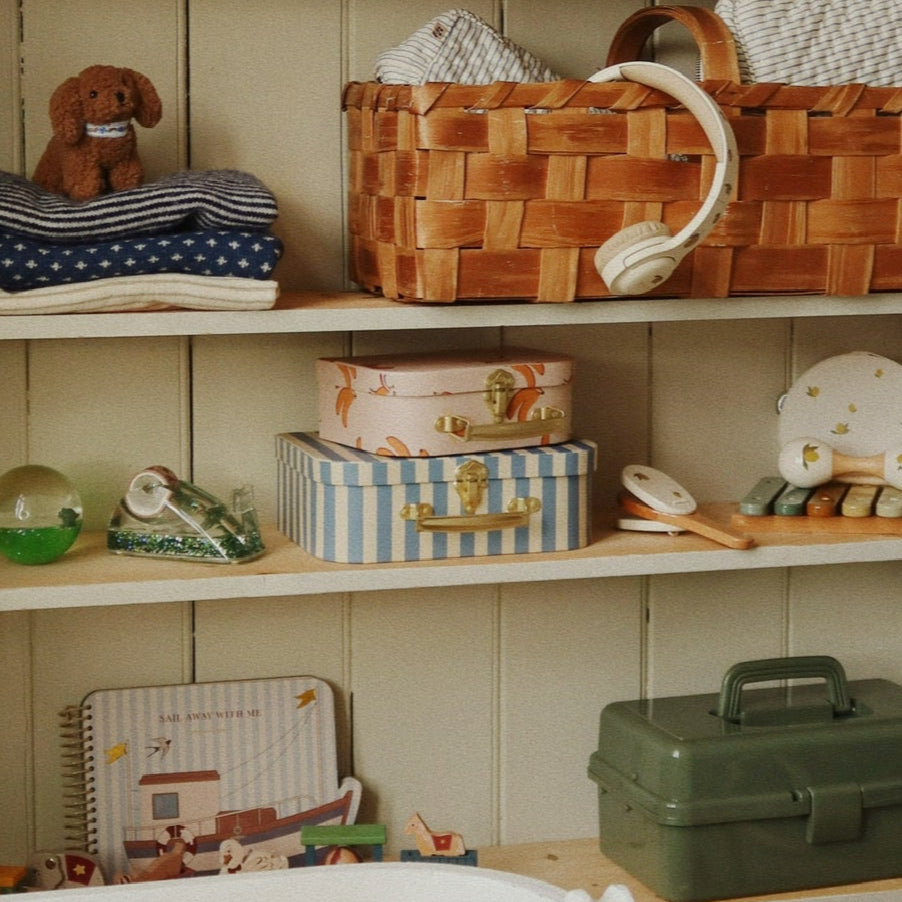 This playful set includes two cardboard suitcases with sturdy metal handles. The smaller case nests neatly inside the larger one, making it ideal for keeping your little treasures safe. Designed for children aged 3 and up, it’s perfect for imaginative adventures.