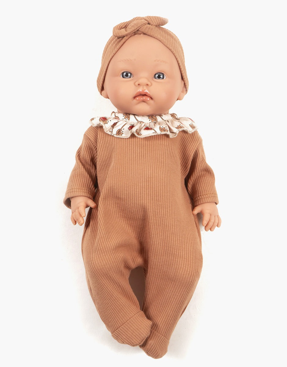 MiniKane - Doll - Iris In Her Brown Ribbed Knit Sleepsuit / Cotton Flowers With Headband