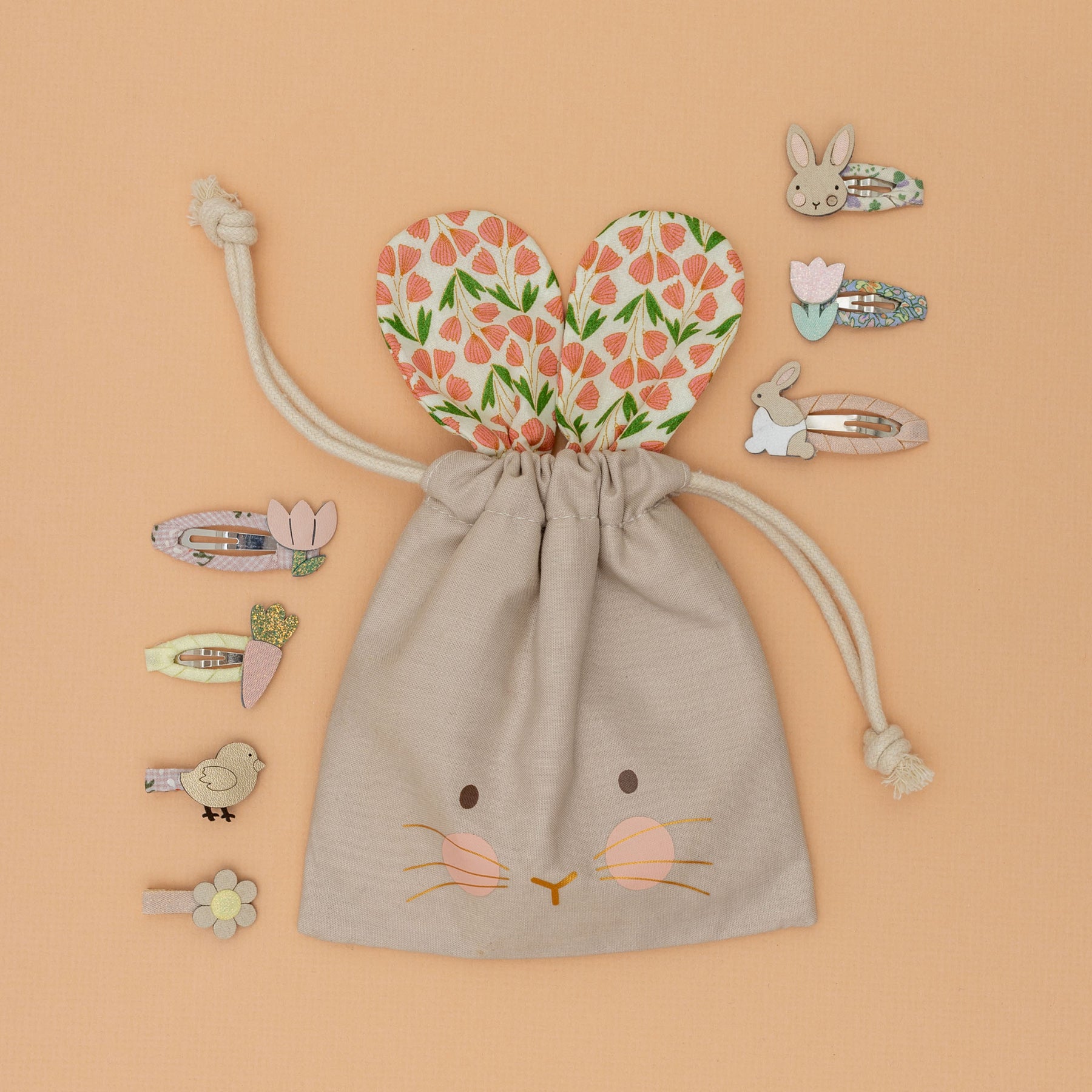 Inside you’ll find 10 hair accessories, including 8 assorted clips and 2 bow ponies, all stored in a soft fabric pouch featuring a printed bunny face, floral fabric ears and a drawstring rope closure.