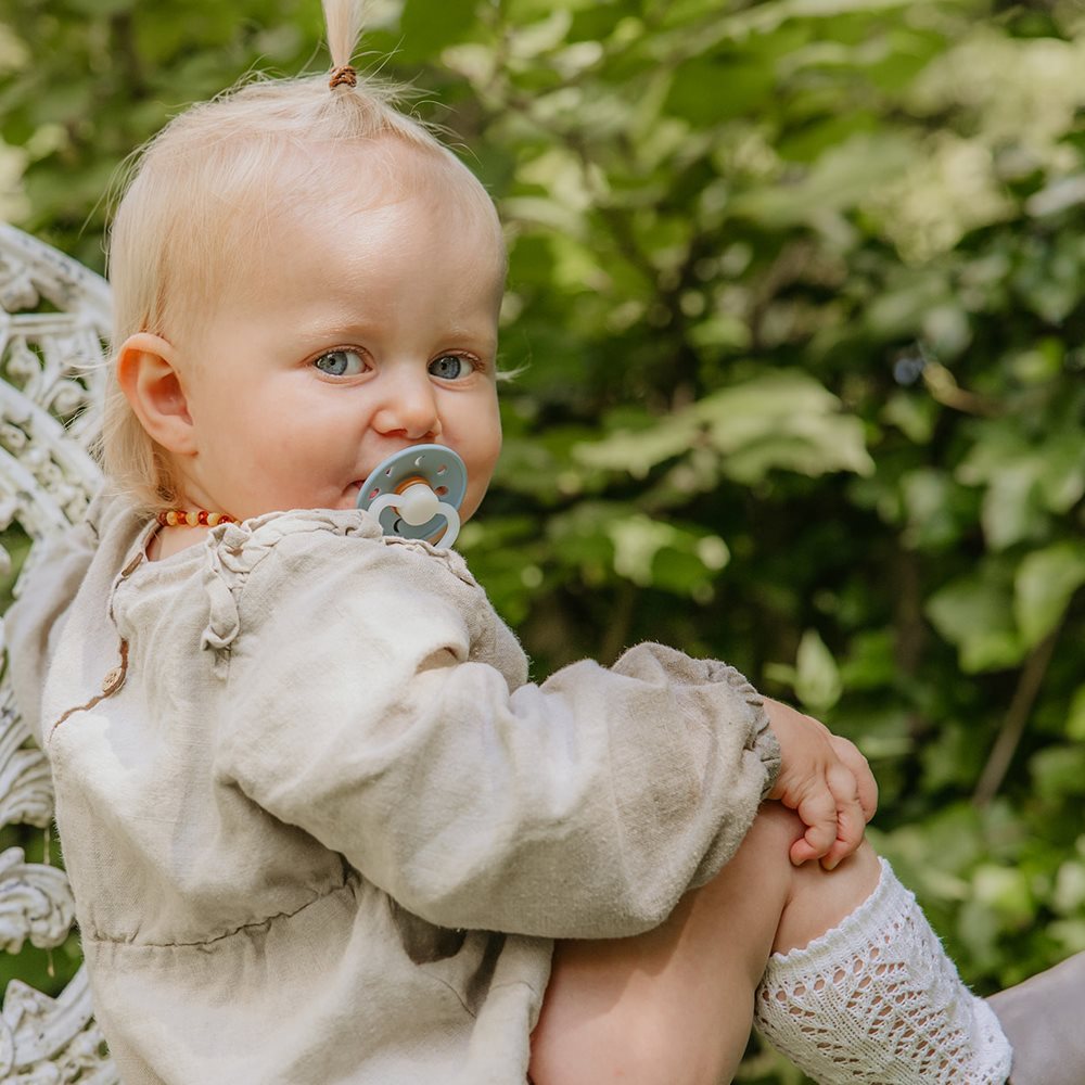 All the pacifiers in FRIGG 6-packs are round pacifiers with a round nipple shape. The round pacifier resembles a mother’s breast in both shape and material. The explanation for this is that when the child is about to breastfed, the tongue rolls up around the nipple and creates a vacuum, which causes the milk to flow. When the child sucks on a round pacifier, it rolls its tongue around it the same way.