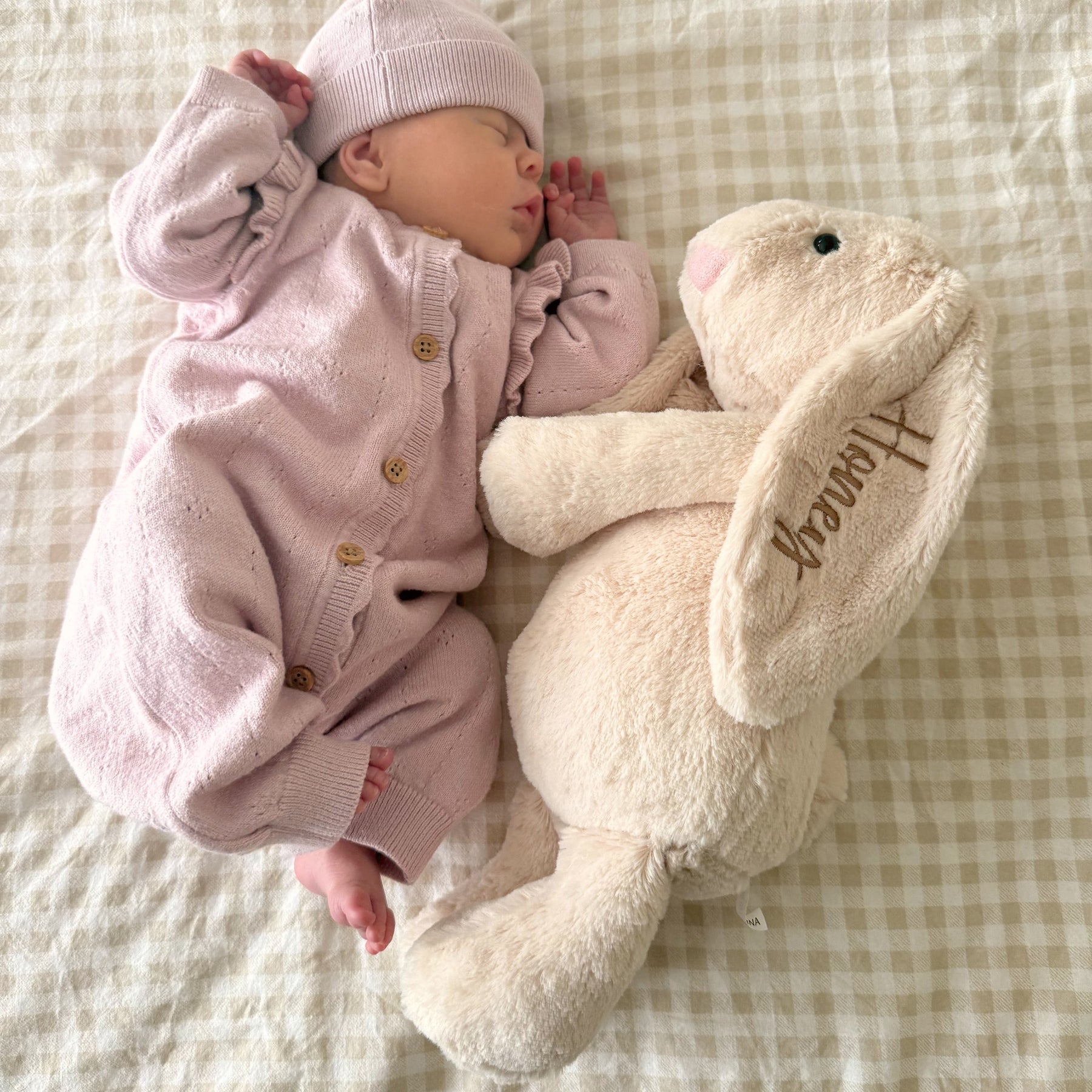 Finished with personalised embroidery on the ear, this bunny becomes a beautiful gift for any little one, soft, huggable, and utterly charming.