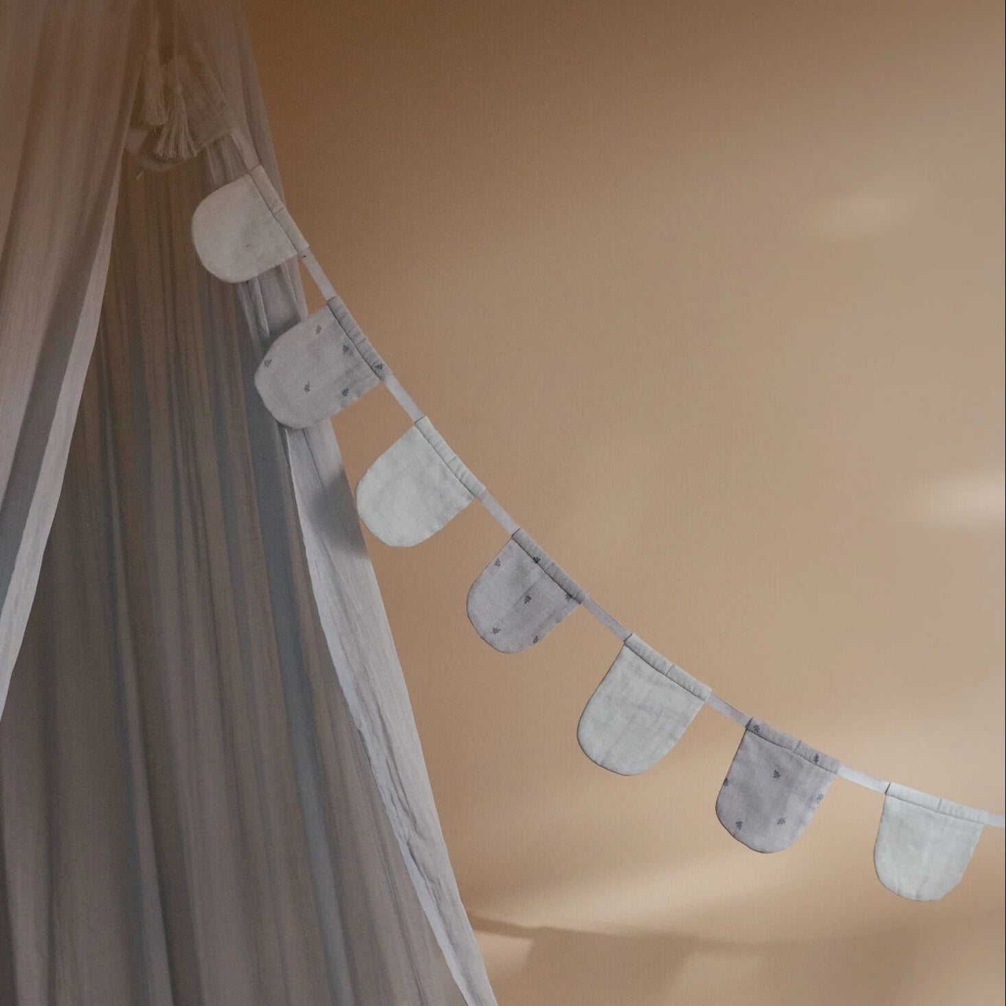 Brighten up the baby or nursery with this pretty garland of round flags.Who says garlands are only for parties! They instantly brighten up a room. On the wall, around the canopy, on a bookshelf or to decorate a play tent. Get creative with this charming muslin garland in the soft colour ‘Pure Denim Blue’.