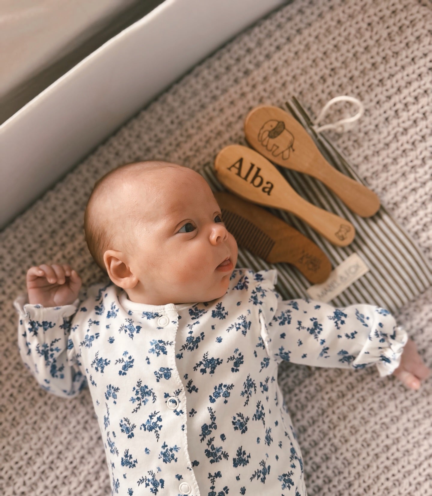 Introducing Mabel & Fox's Personalised Wooden Brush Set, a must-have for babies. Featuring three high quality wooden brushes, paired with a beautiful reusable brown striped bag for added convenience. The wooden bristle brush is engraved with your choice of any name, while the matching goat hair brush has a complimentary elephant illustration.
