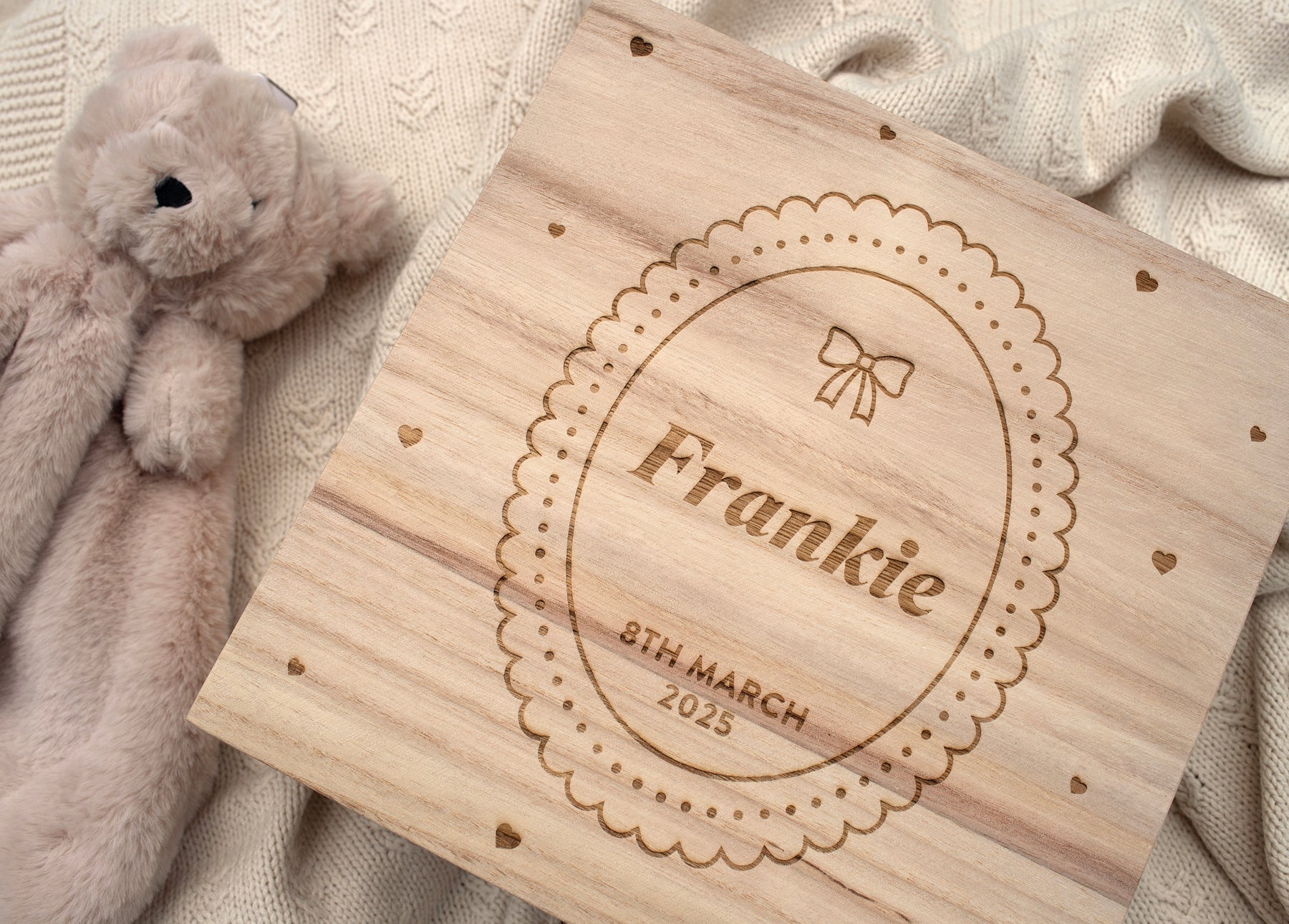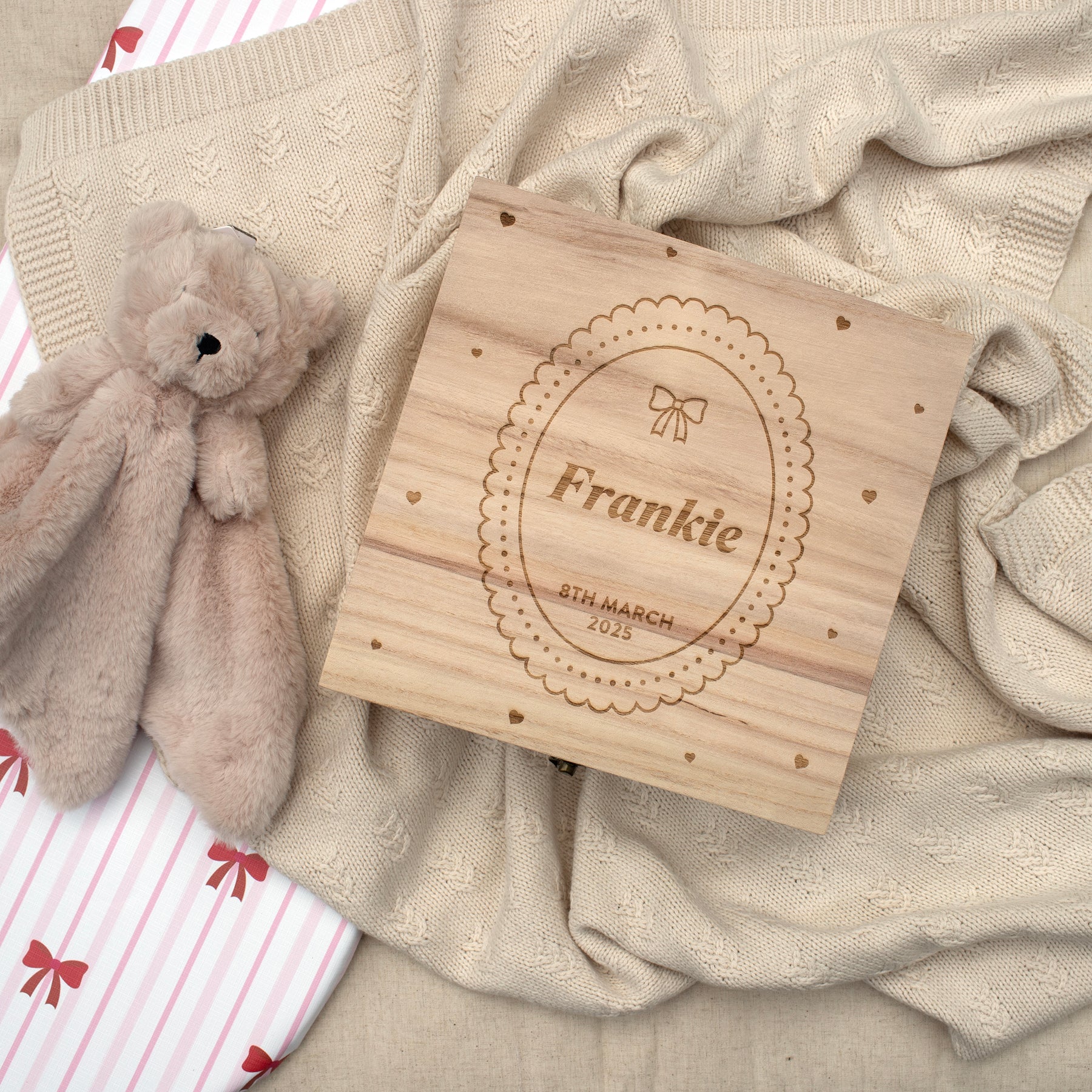 These beautiful wooden boxes features a heart and bow design engraved on the top and can be personalised with any name and date, to create a unique gift for any loved one.