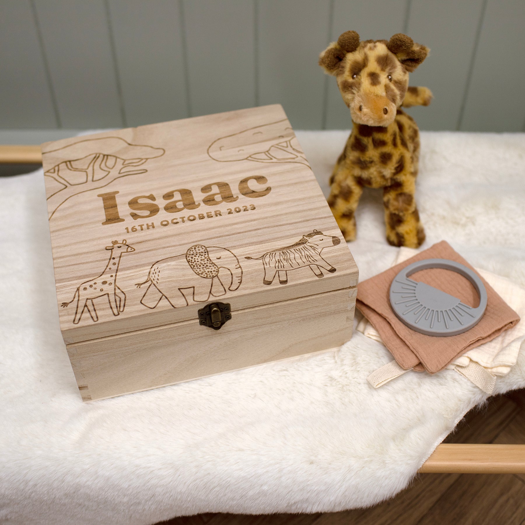 These beautiful wooden boxes features a safari design engraved on the top and can be personalised with any name and date, to create a unique gift for any loved one.