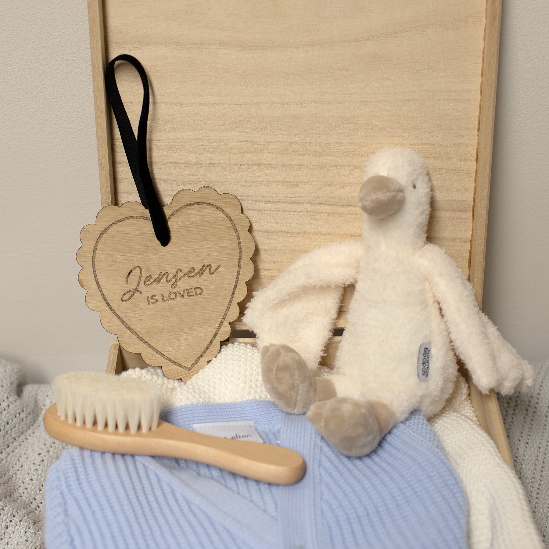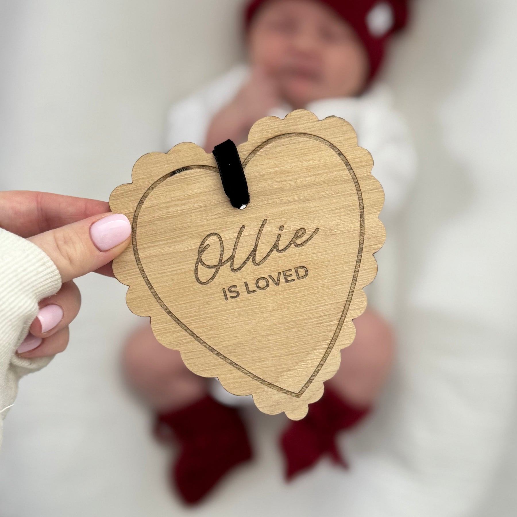 Add a thoughtful finishing touch to any gift or nursery space with a Mabel & Fox personalised wooden heart tag.
