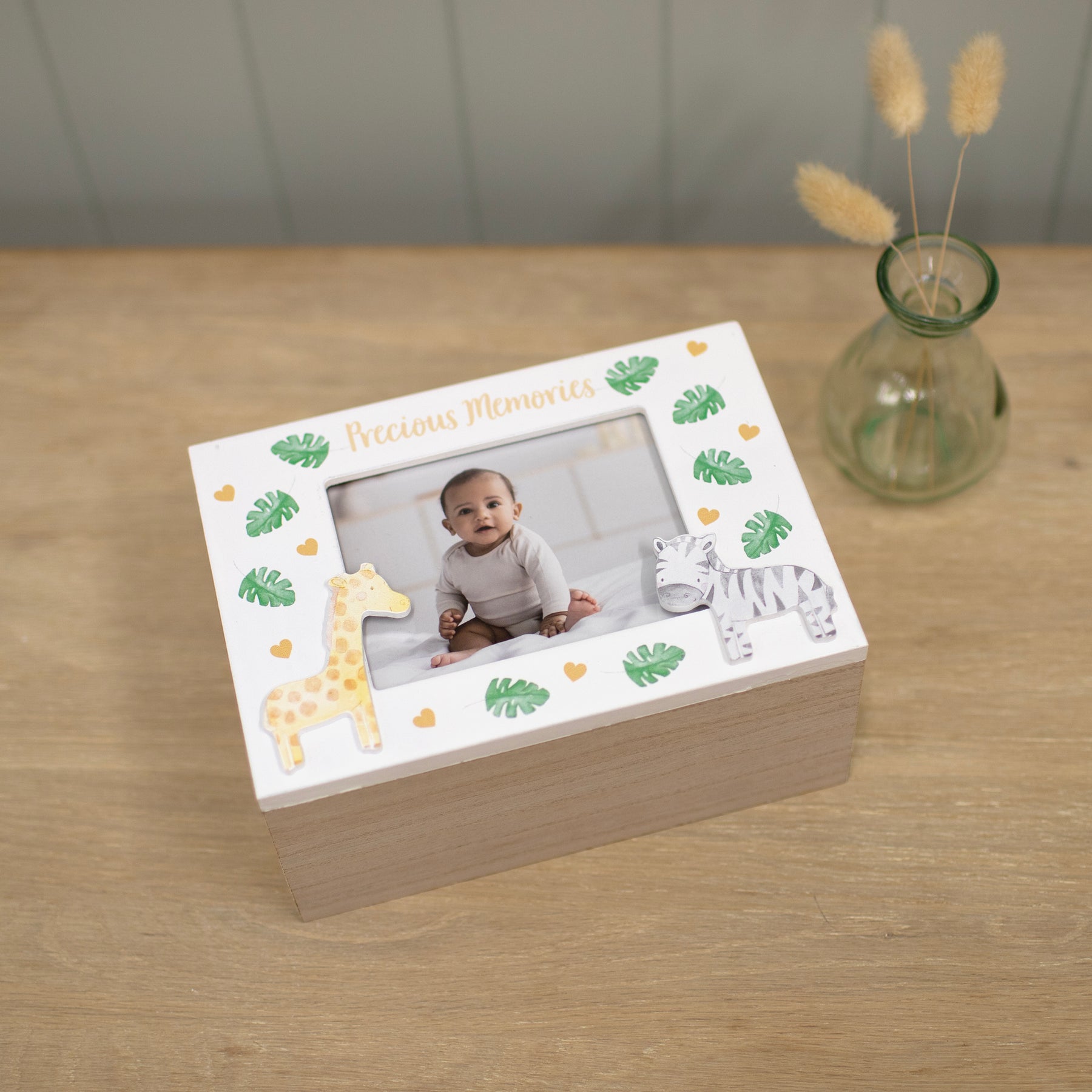 Keep your little one's precious memories safe and organized with Mabel & Fox's Wooden Keepsake Box in a playful safari print! This high quality box features space for a photo on the front, making it a unique and thoughtful baby shower or birthday gift.
