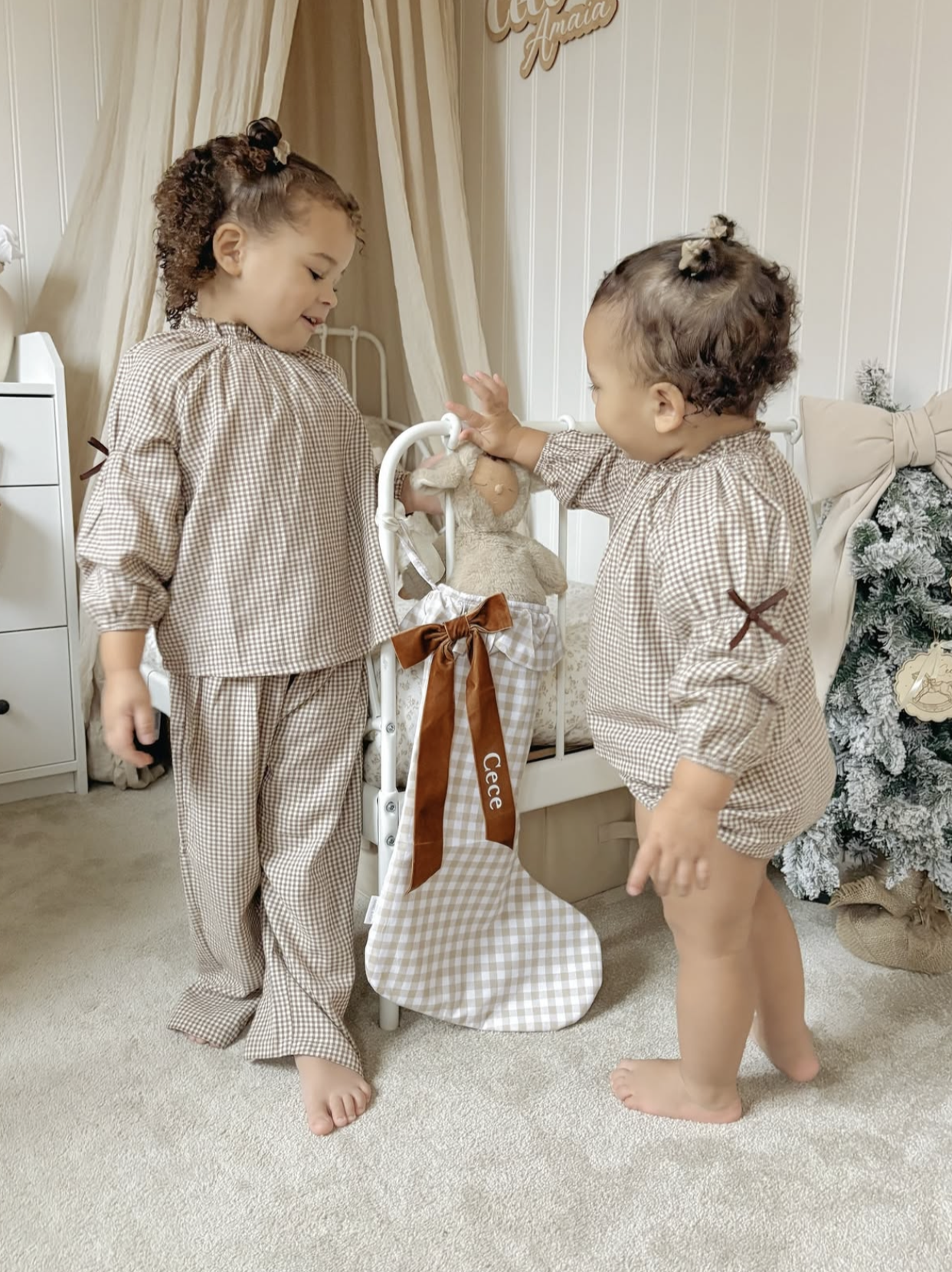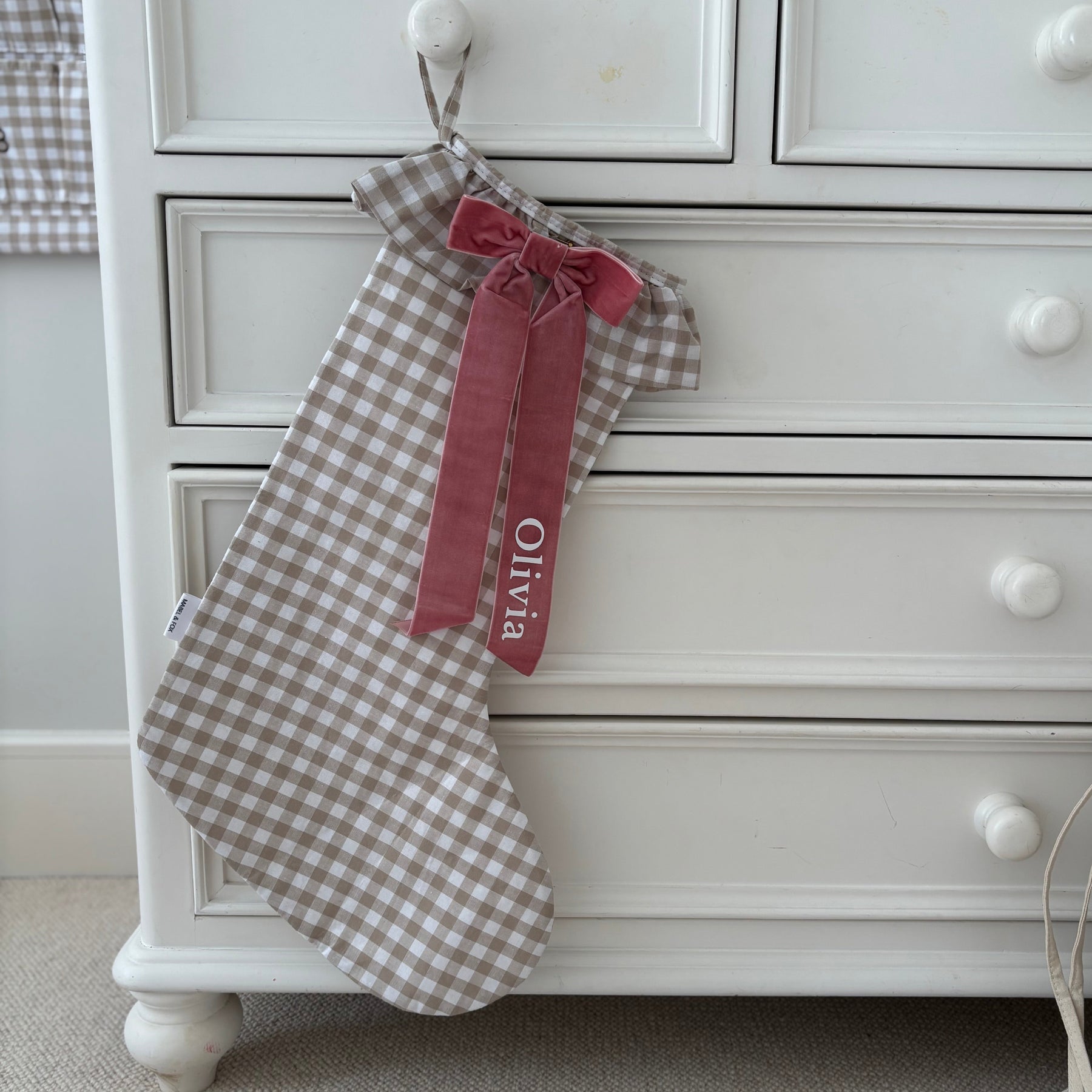 Mabel & Fox - Personalised Beige Gingham Stocking - Velvet Bow - Mabel & Fox