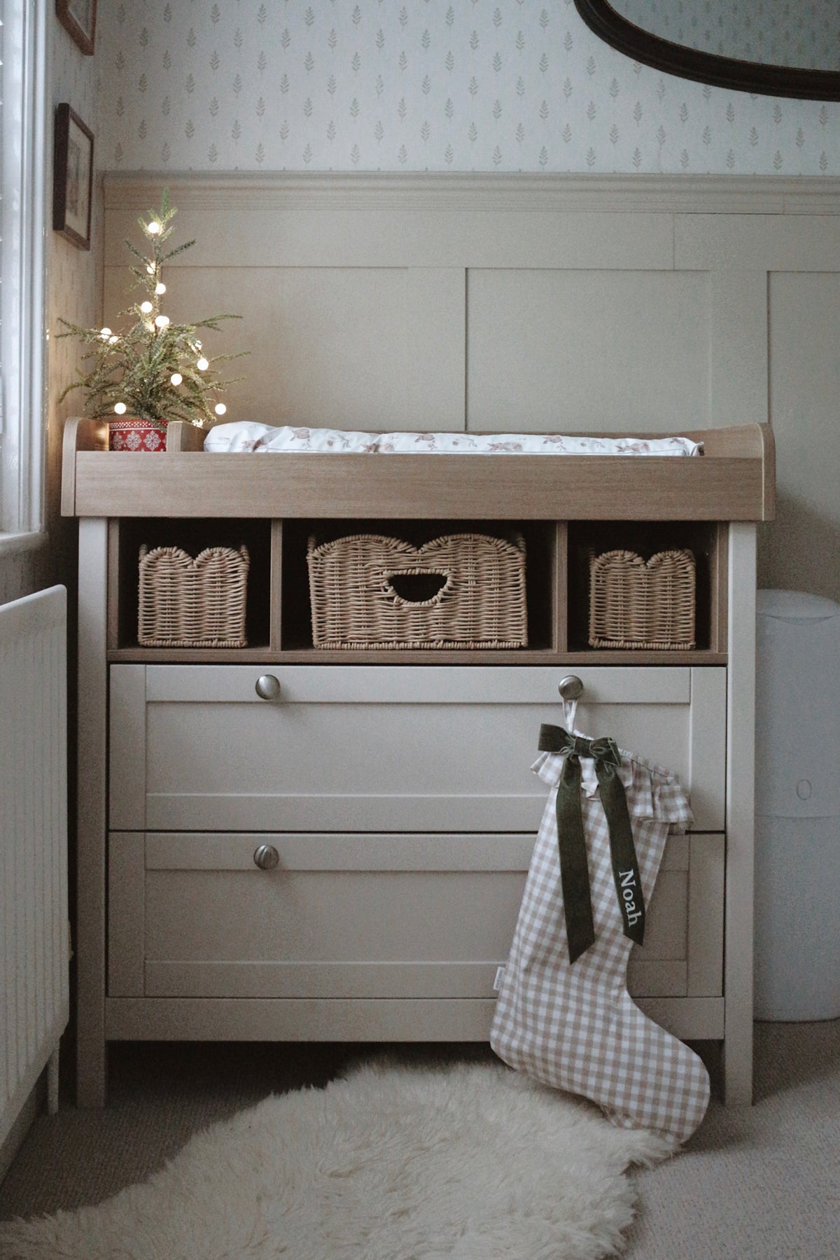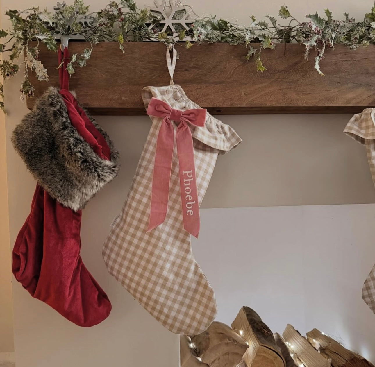 Elevate your festive decor with our Mabel & Fox Personalised Stocking in beautiful gingham fabric. Finished with a luxurious velvet bow that can be personalised with a name and available in six stunning ribbon options. Perfect for Christmas morning and designed to be treasured year after year!