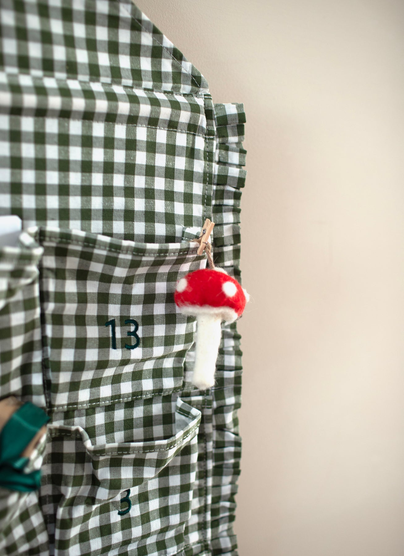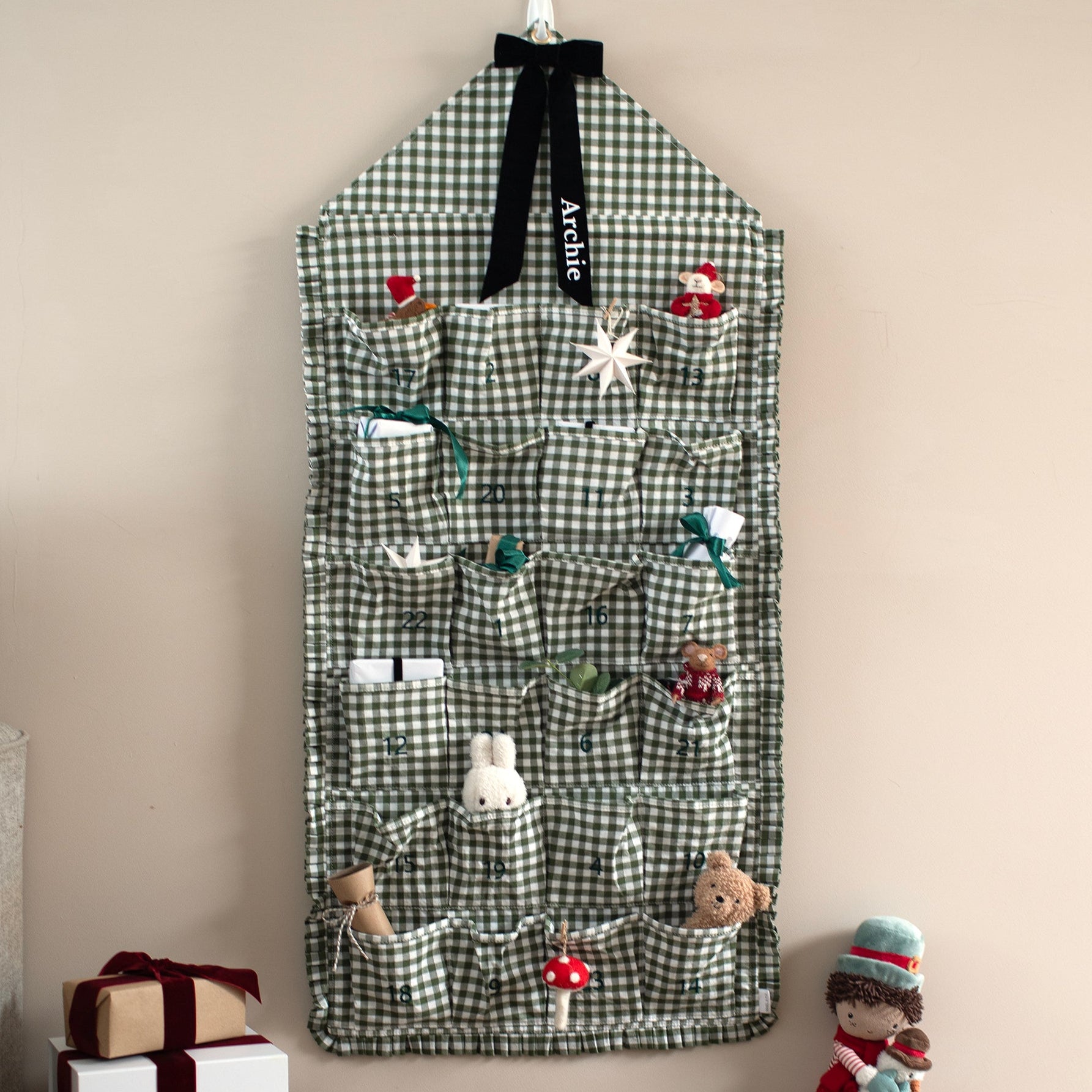 Countdown to the most wonderful time of the year with a Mabel & Fox's Personalised Green Gingham Ruffle Advent Calendar! This beautiful calendar features embroidered numbers, a stylish ruffle edging and a luxurious personalised velvet bow, making it the perfect bespoke addition to your festive decor.