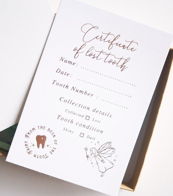 Crafted from vegan-friendly faux leather and heat embossed with our unique quote, this set features a blue pick-up purse, a Blue coin pouch, and five gold-foiled certificates, all beautifully presented in a letterpress gift box. Ideal for leaving out overnight, its the perfect companion for those loose or missing teeth moments.
