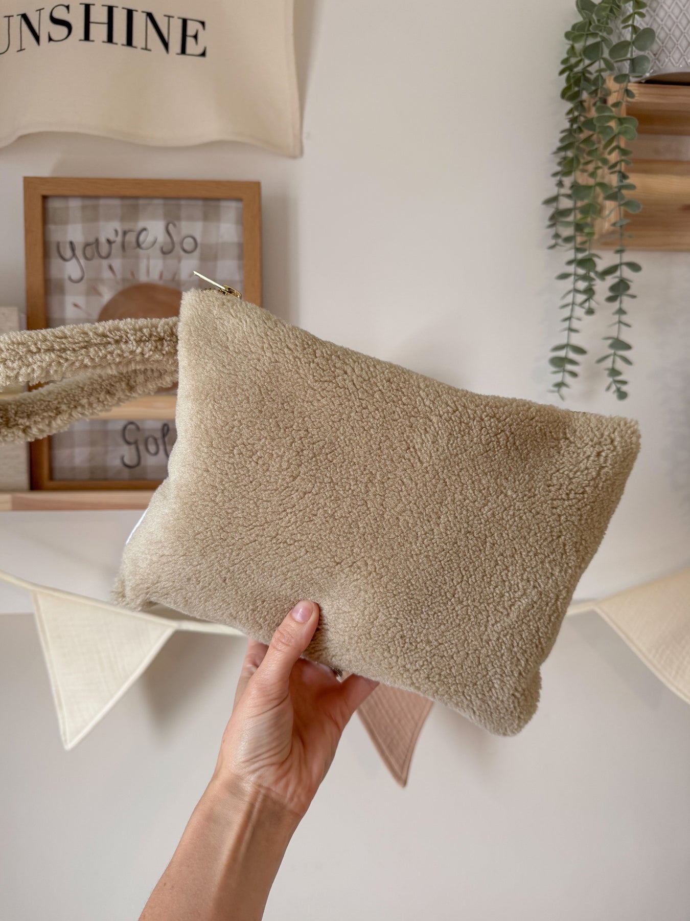 Carry all your baby's essentials in style with the Mabel & Fox Teddy Pouch! Made from super soft teddy bear material, this beautiful biscuit coloured pouch is practical by itself or can be added to a changing bag for extra storage.