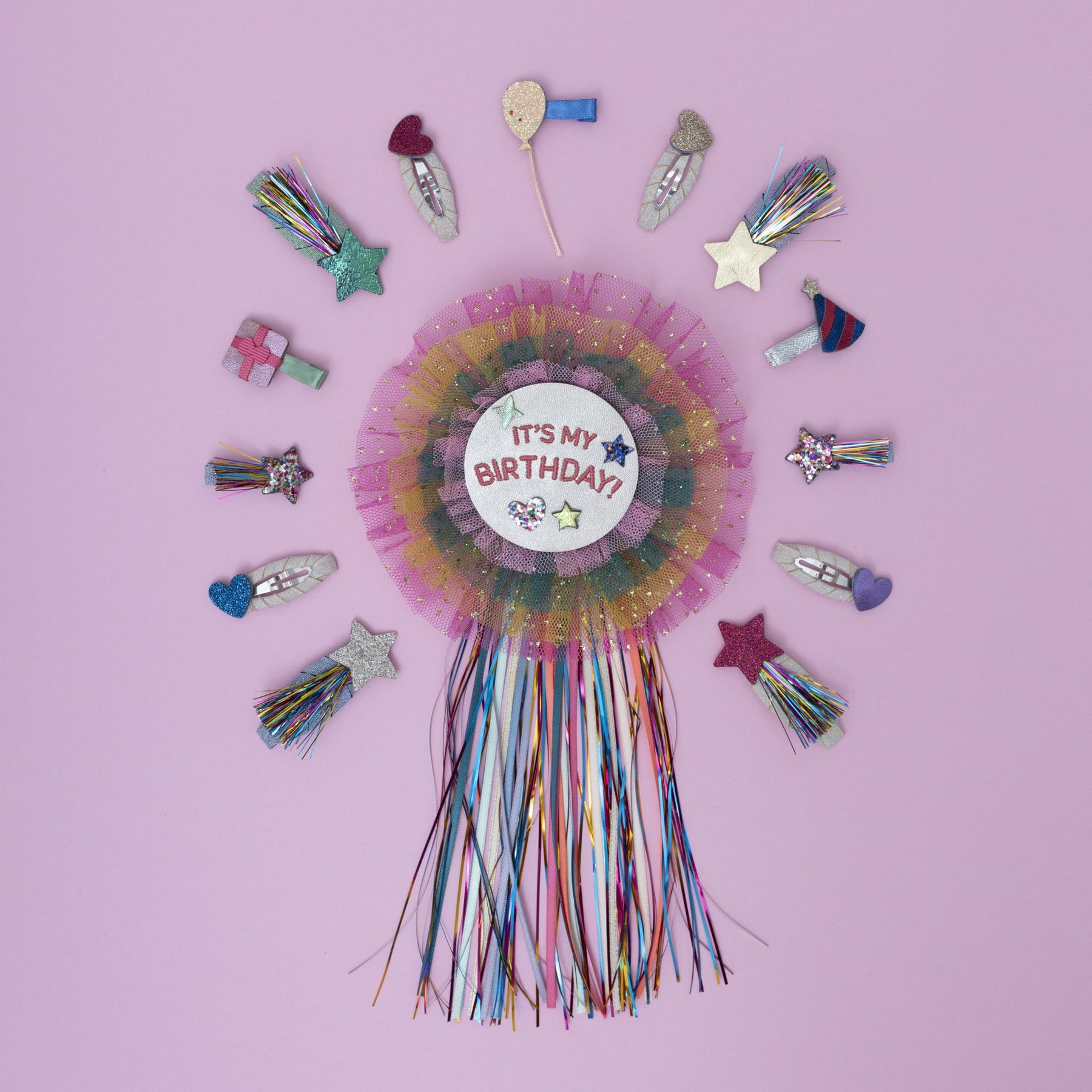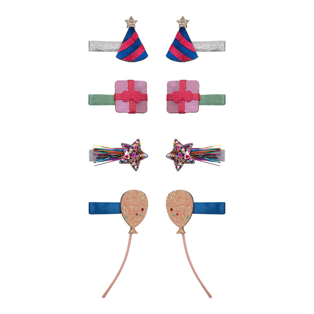 Celebrate in style with our Birthday Party Mini Clips! Featuring star-topped party hats, glitter balloons, shooting stars, and ribbon-wrapped gifts, these clips bring extra joy and sparkle to any birthday outfit.