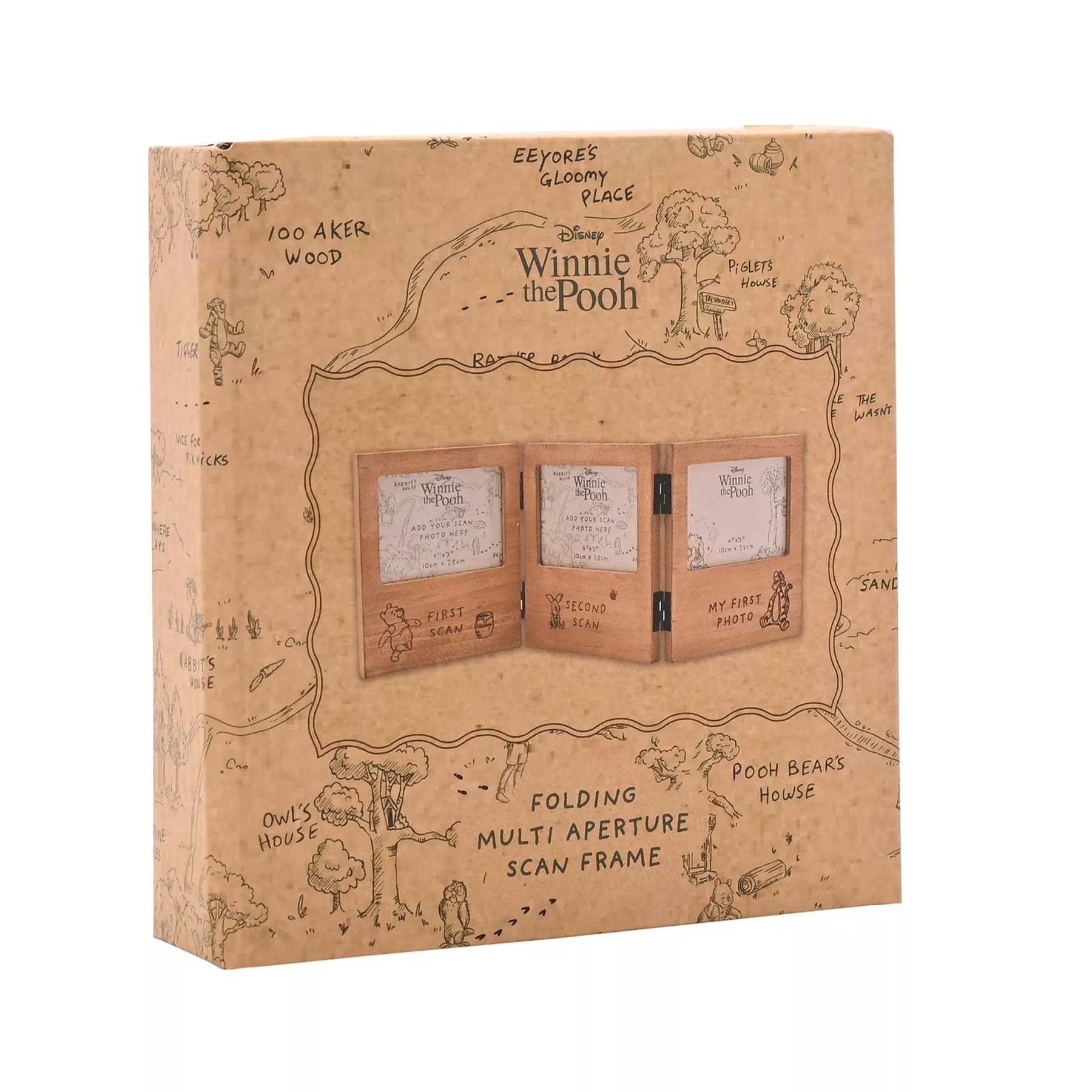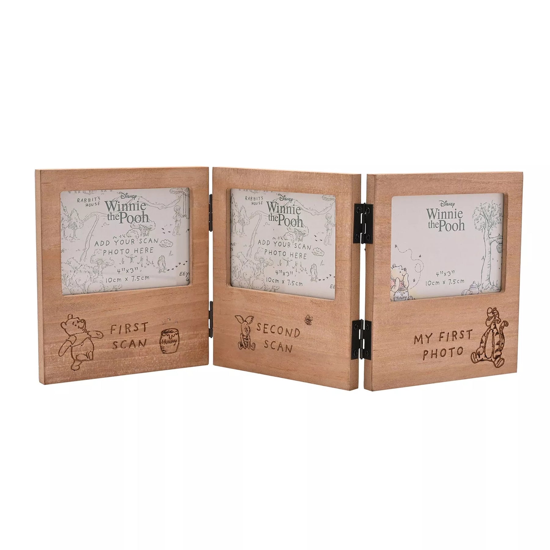 Celebrate your little one’s magical milestones with this charming Disney Winnie the Pooh folding scan frame. Featuring delightful illustrations of Pooh and his friends, this wooden tri-fold frame holds two scan images and a first photo, making it perfect for showcasing your baby’s earliest memories. It folds flat for easy storage or display, bringing a touch of classic Winnie the Pooh magic to any nursery or family room.