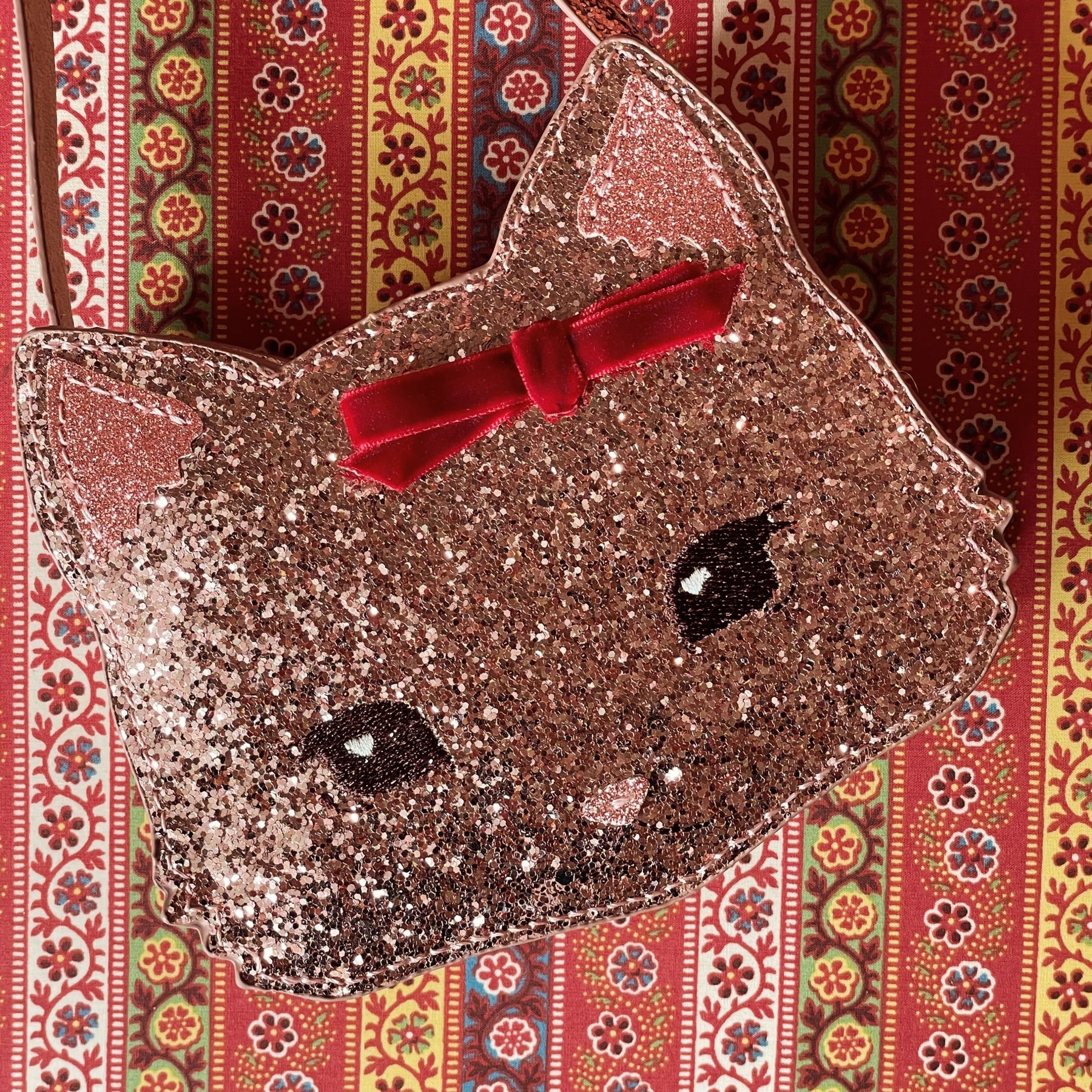 Shoulder bag shaped like a sparkling little kitty with cute ears and a decorative velvet bow. Designed with a slim shoulder strap and easy zipper closure. Perfect for carrying all your little essentials over the shoulder. .