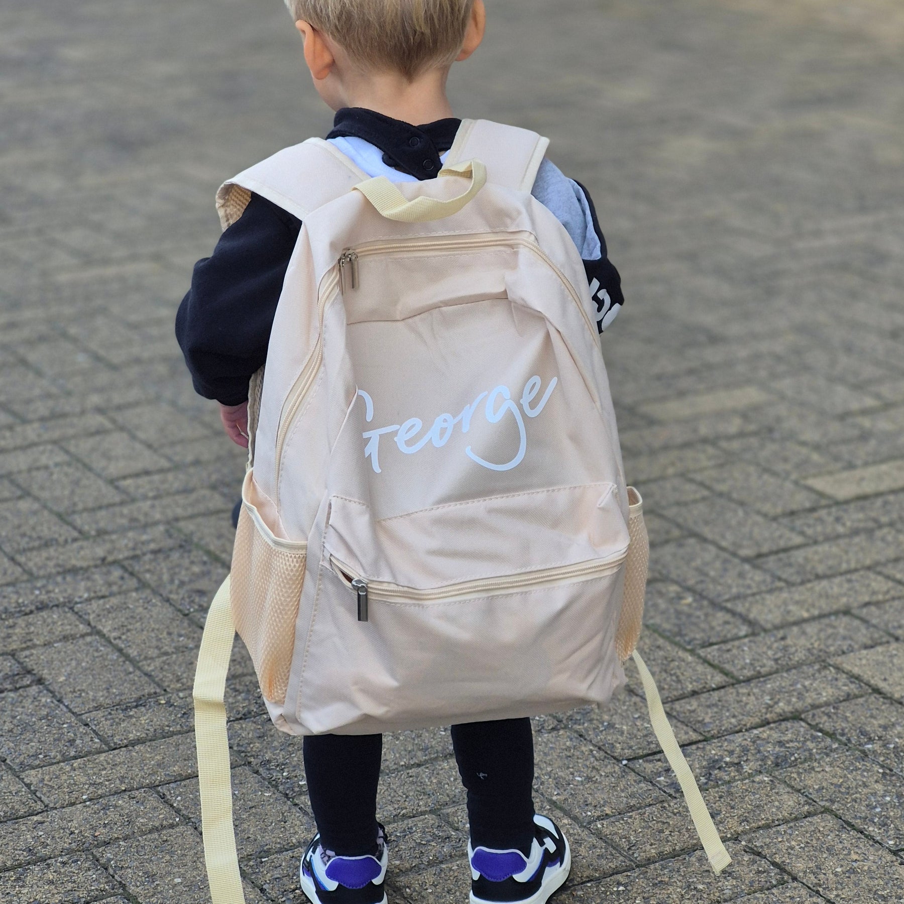 This charming kids Mabel & Fox backpack in a beautiful cream shade is perfect for little adventures. Personalised with your child’s name in white vinyl, it adds a special touch just for them. Adjustable shoulder straps ensure a comfy fit, while the front zipped pocket and side bottle holders keep essentials close at hand.
