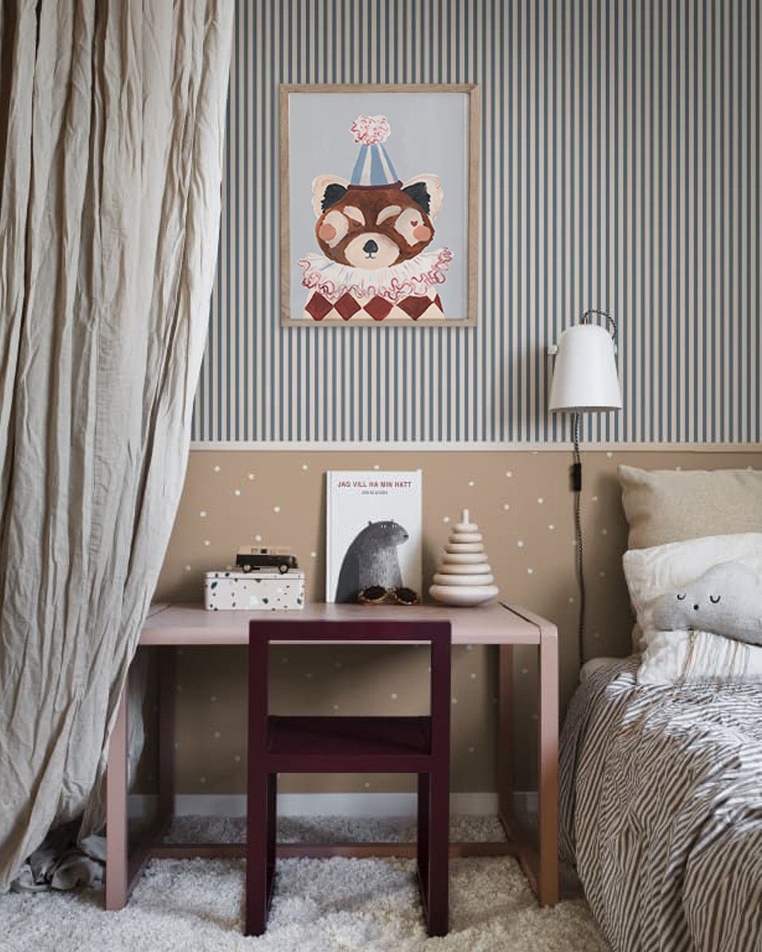 This hand-painted Pierrot Panda print brings a whimsical charm to any Scandi-style circus-themed room, adding a delightful splash of fun to their decor.