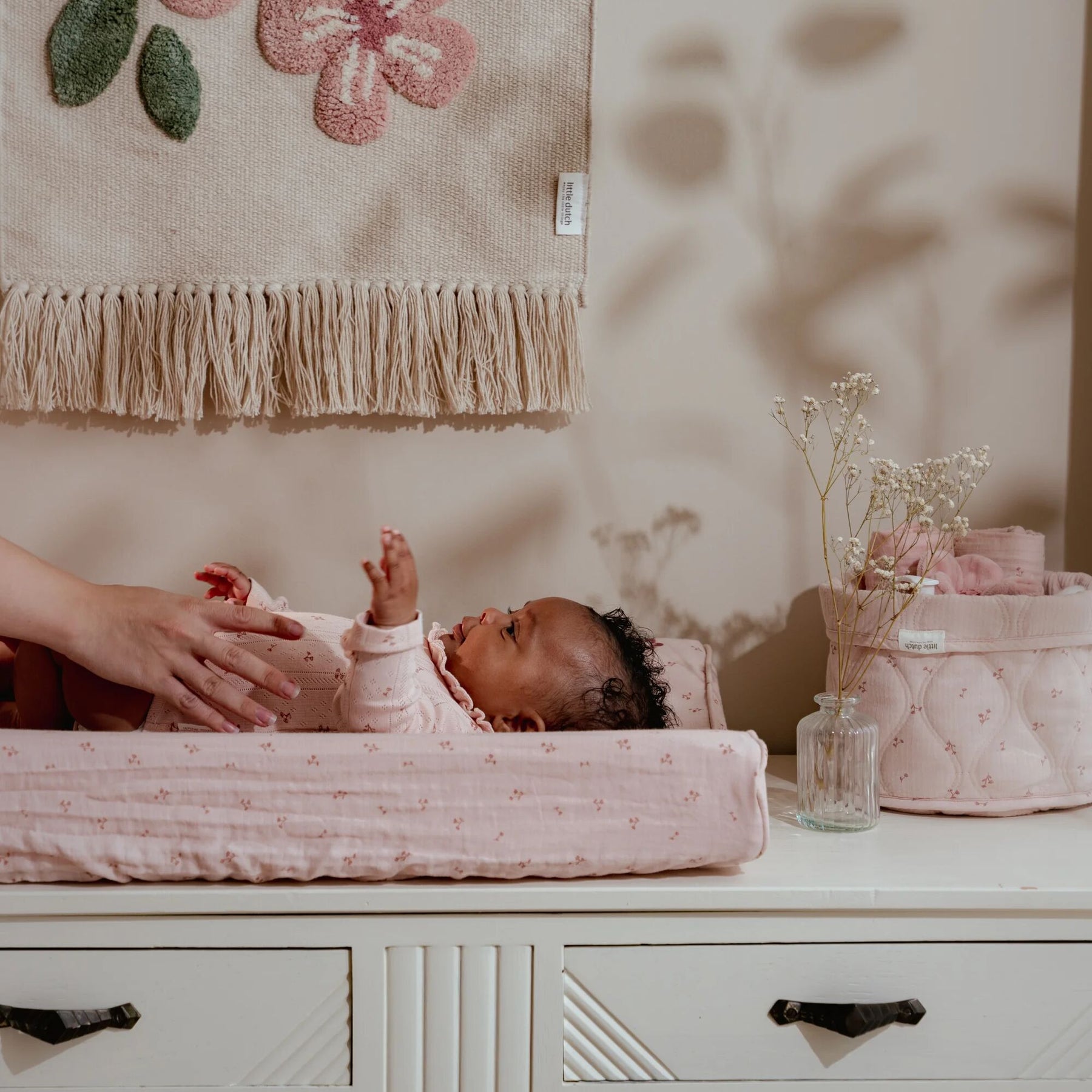 This handy Little Dutch changing basket will keep nappies, tubes and bottles neatly organised and always within easy reach! The basket is sturdy and beautifully finished, a real asset for the nursery. The soft Pure Blossom Pink colour and subtle print add a soothing touch, and the basket is also reversible for variety. This must-have is available in different sizes, shapes and colours.
