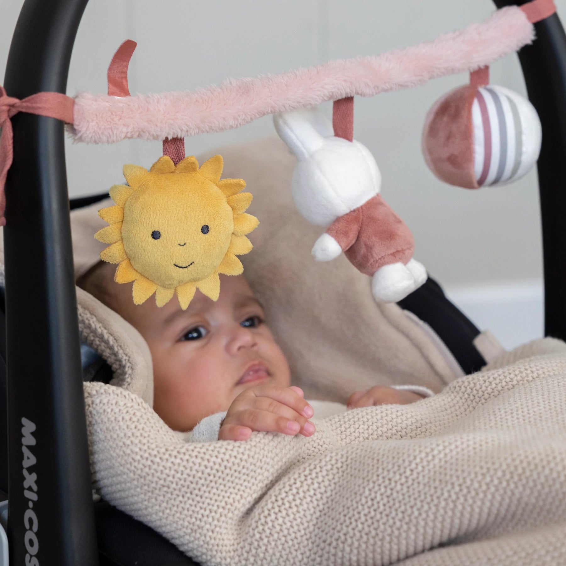 There will never be a boring walk or car ride again with this fun toy from Miffy. The car seat toy contains three toys, each with a different activity: crinkle paper, a squeaker and a rattle.