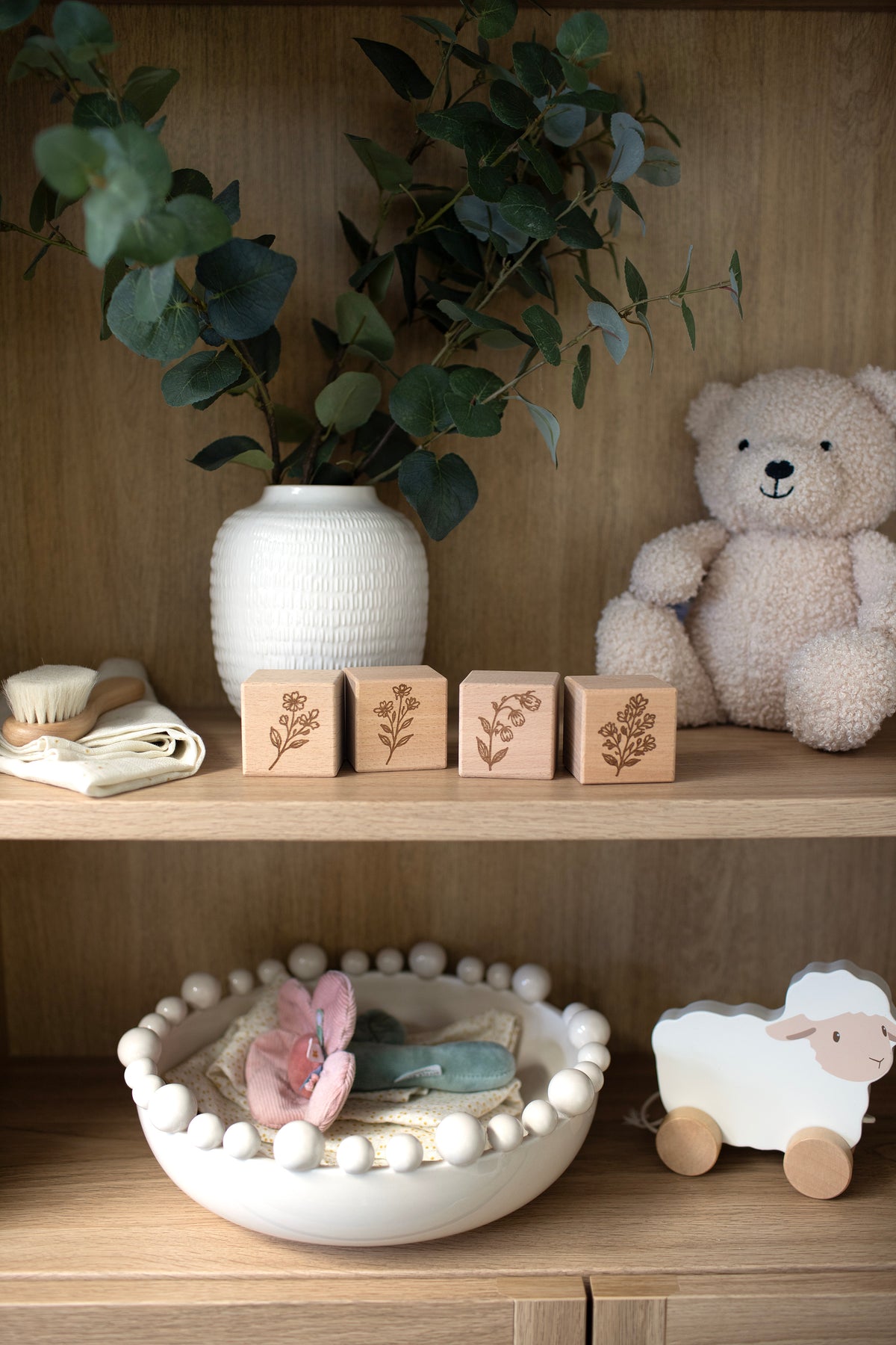 Add a decorative touch to your nursery with this set of 4 Mabel & Fox Wooden Blocks. Crafted from solid beech wood, these beautifully engraved blocks feature our wildflower design and are perfect for styling on a shelf or dresser. They can be displayed on their own or paired with our letter blocks to create a personalised statement. A lovely keepsake piece and a thoughtful gift for a baby shower or new arrival.