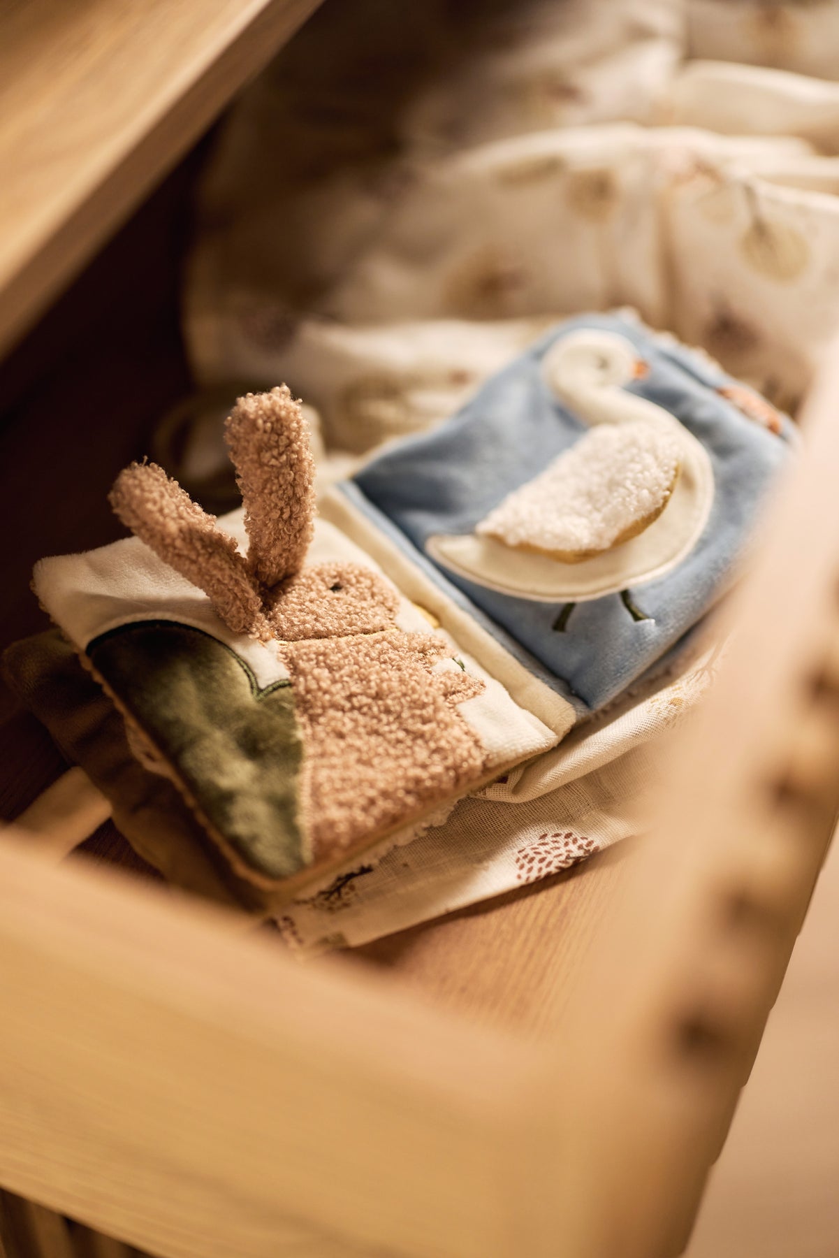 This soft activity book from the Tiny Park collection is specially designed to stimulate your baby’s senses. It features four pages, each with a cute animal character like a bunny, bird, duck, or swan. The pages are filled with crinkly materials that encourage exploration and play. A mirror and little trees on the pages add even more interest. A perfect toy to help develop your little one’s senses and motor skills!